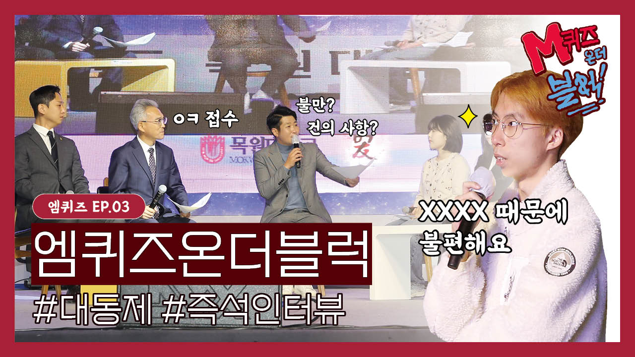 목원대학교의 축제 '대동제'를 통해 진행한 이번 에피소드는 학생들이 준비한 질문과 더불어 축제 현장 즉석에서 학생들의 건의 사항들까지 들어보는 시간을 가졌는데요, 우리 대학의 자랑거리부터 건의 사항까지 들어본 엠퀴즈온더블럭 세 번째 이야기 지금 확인해보세요~!