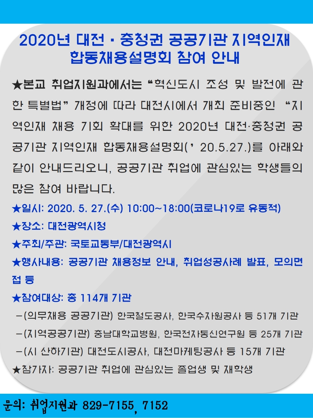 2. 위 호 관련, 본교 취업지원과에서는 “혁신도시 조성 및 발전에 관한 특별법” 개정에 따라 대전시에서 추진중인 지역인재 채용 기회 확대를 위한 “2020년 대전・충청권 공공기관 지역인재 합동채용설명회(’20.5.27.)를 아래와 같이 안내드리오니, 각 학부(과)에서는 우리 졸업생 및 재학생들이 많이 참여할 수 있도록 적극 안내 및 독려하여주시기 바랍니다.