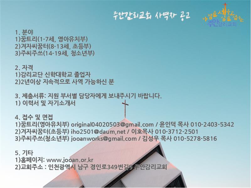 복음적 목회자, 민족복음화,인천 주안교회(담임목사: 한상호)에서 다음세대 전도사님을 모십니다.