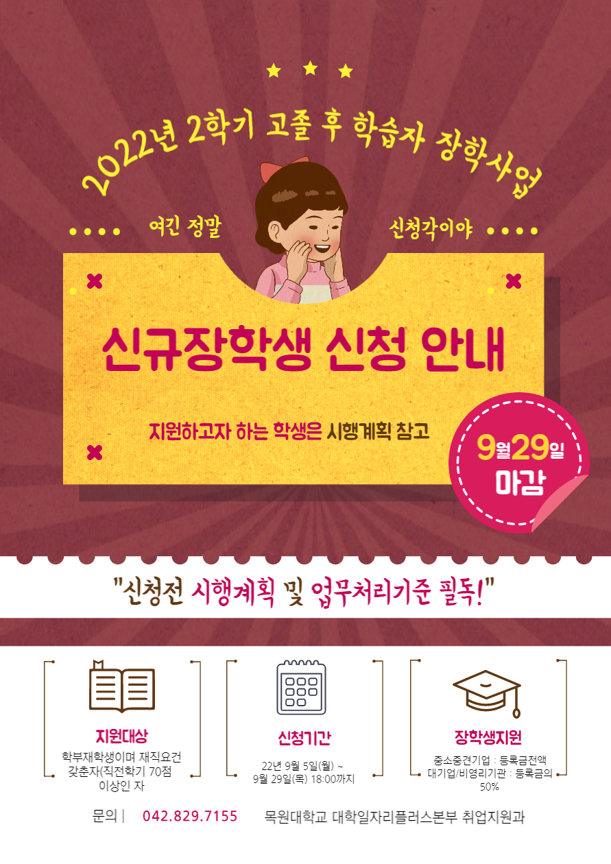 1)(지원대상)대한민국 국적자로 학부 재학생이며, 재직요건을 충족한 학생 중 직전학기 성적이 100점 만점의 70점 이상인 자 ※신입·편입(재입학)생은 성적 심사 제외