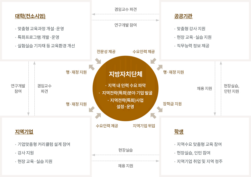 지방자치단체는 지역 내 인력 수요 파악, 지역전략(특화)분야 기업 발굴, 지역전략(특화)사업 설정·운영을 합니다. 지방자치단체는 대학과 공공기관, 지역기업으로 행·재정 지원을 하고, 학생들에게 장학금을 지원하기도 합니다. 대학은 지방자치단체에 전문성을 제공하며, 공공기관은 지방자치단체에 수요인력을 제공, 학생은 지방자치단체에게 지역기업 위업, 지역기업은 지방자치단체에게 수요인력을 제공합니다.