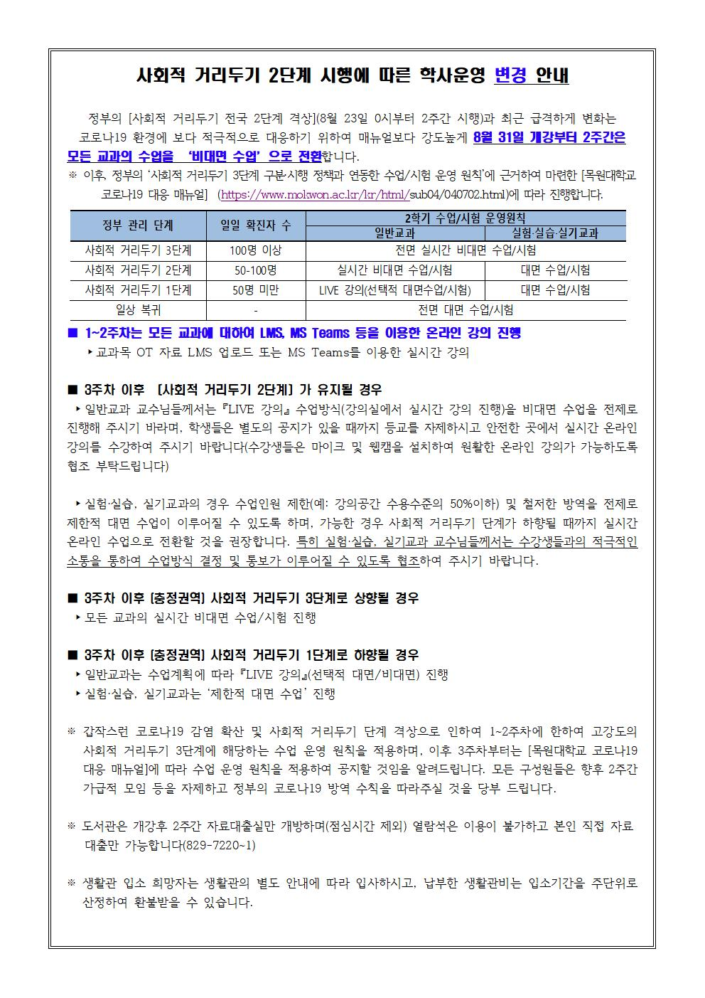 3. 자세한 사항은 학사공지 <사회적 거리두기 2단계 시행에 따른 학사운영 변경 안내> (https://www.mokwon.ac.kr/site/kr/html/sub06/0602.html?mode=V&no=1e1f4e30ea64be33d3652441ccf6569e)