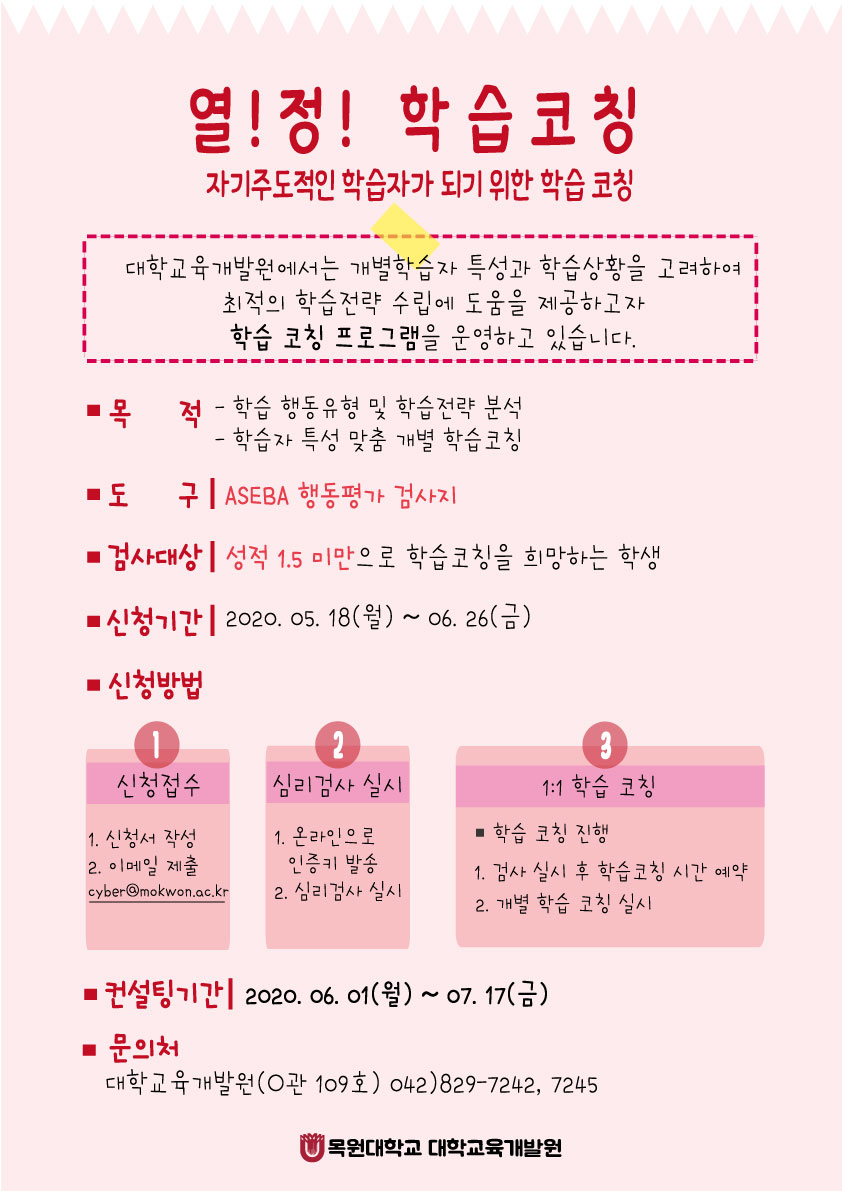 1) 대상 : 직전학기 성적 1.5 이상 2.5 미만으로 학습코칭을 희망하는 학생