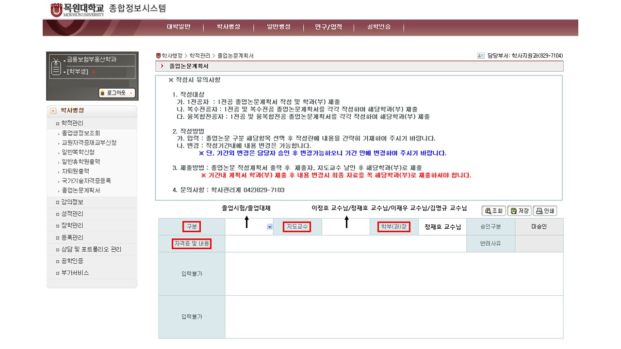 목원대학교 종합정보시스템 → 학사행정 → 학적관리 → 졸업논문계획서