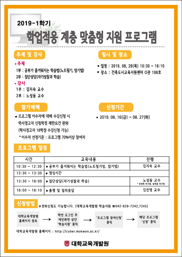 학습역량 개선 및 학업동기부여를 지향하는 학업적응계층 맞춤형 워크숍을 개최하오니 많은 참여 바랍니다.