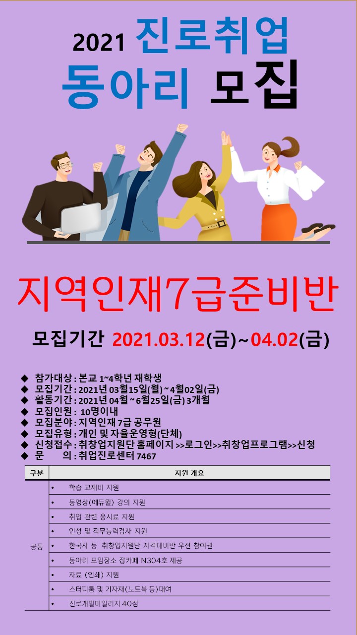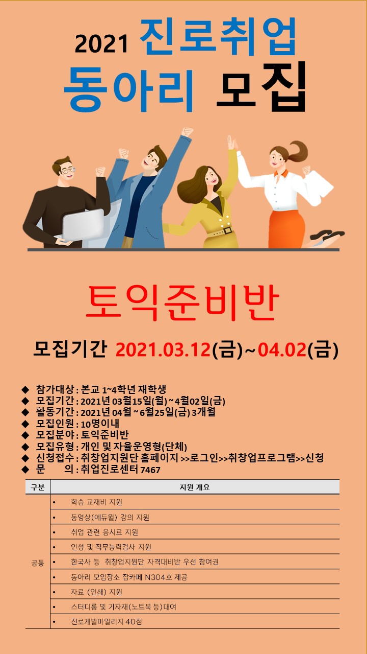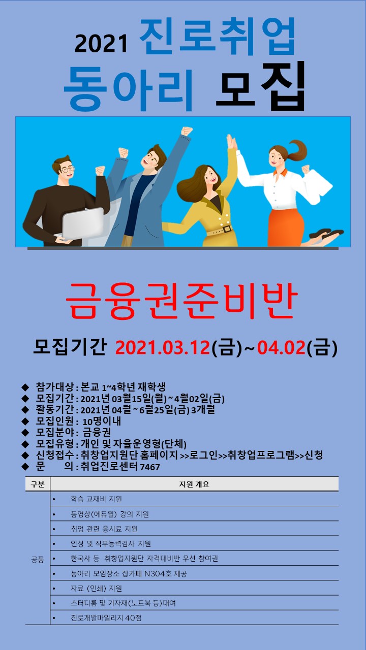 정상에서 만납시다본교 취업진로센터에서는 재학생들의 자율적인 동아리 활동을 통해 진로 탐색 및 취업역량 강화를 위하여 아래와 같이 2021년 1학기 진로취업동아리를 운영하고자 하오니 관심있는 학생들은 많은 참여 바랍니다.