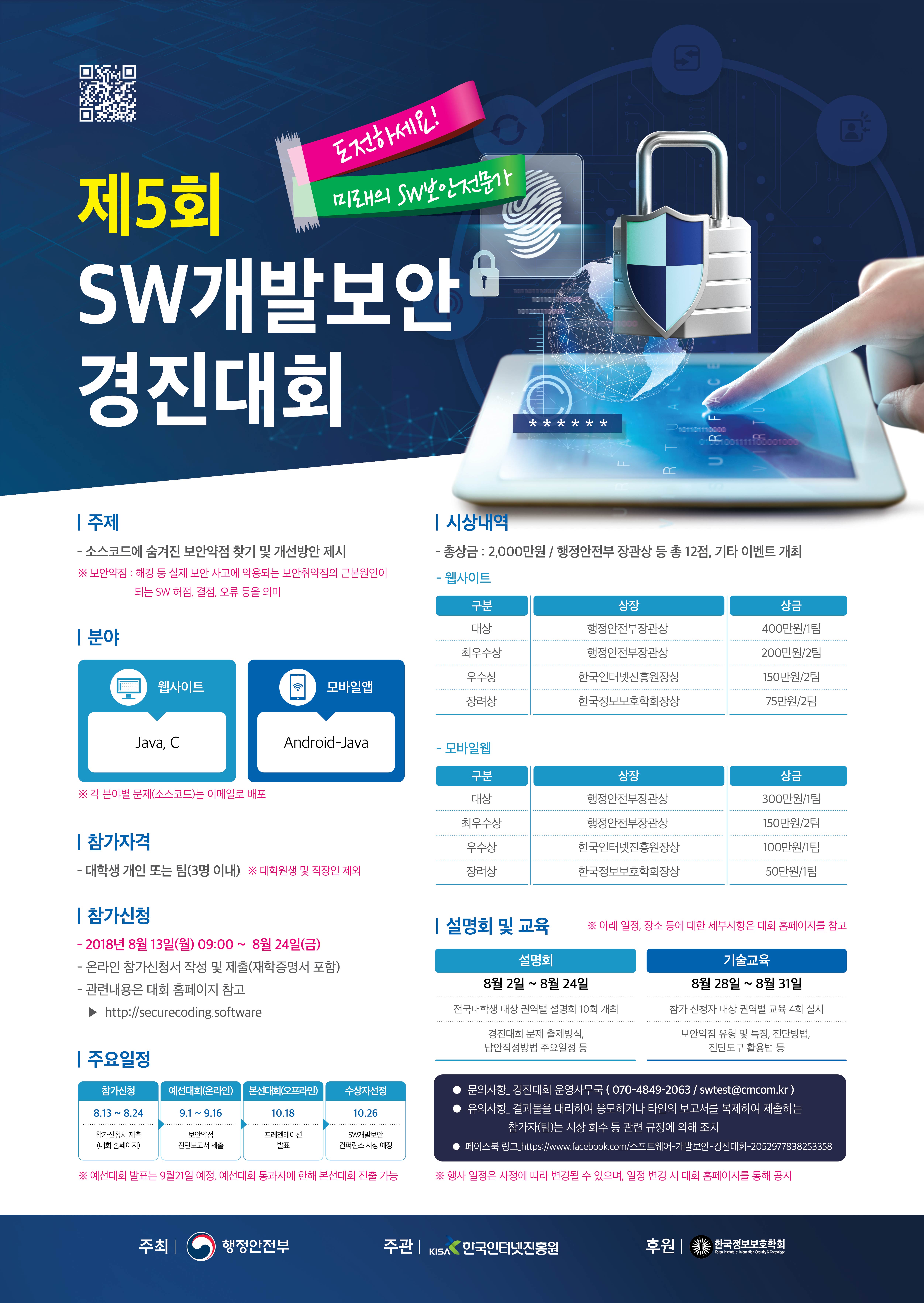 행정안전부에서는 미래의 주역인 학생들에게 해킹공격 등으로부터 안전한 SW 개발방법을 체험할 수 있는 기회를 제공하고, 차세대 SW 보안전문가를 발굴하고자 아래와 같이5회 소프트웨어 개발보안 경진대회를 개최합니다.