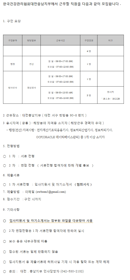 한국건강관리협회에서는 전산 직원 2년 계약직을 모집 합니다. 계약 후 문제가 없는 한 2년 후 심사하여 무기계약 또는 정규직이 가능하오니 관심있는 학생들의 많은 지원 바랍니다.