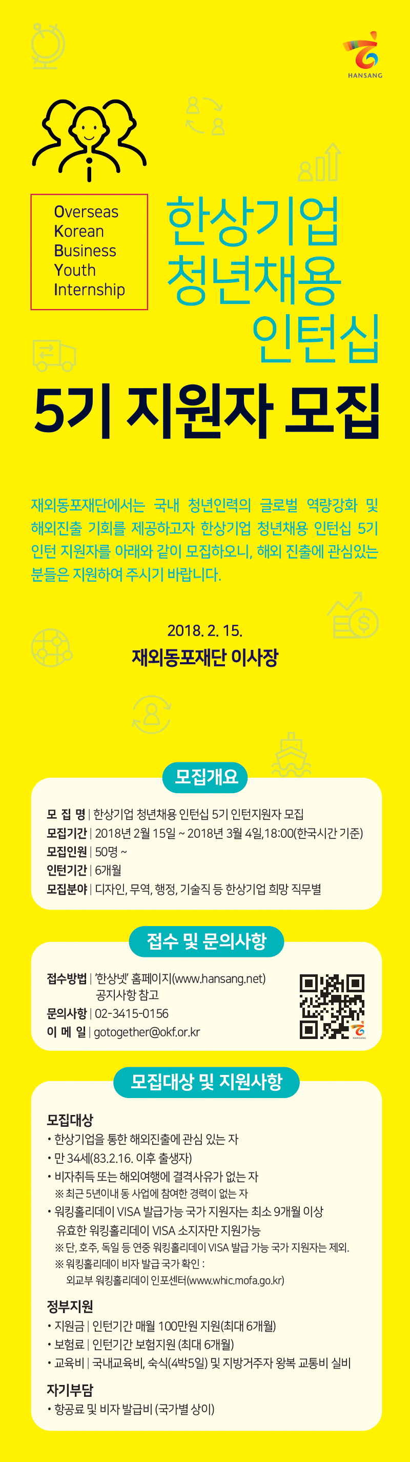 ONE STEP AHEAD!재외동포재단은 1997년 설립된 외교부 산하 정부출연기관으로서, 전 세계 720만 재외동포들이 민족적 유대감을 유지하면서 거주국 내에서 그 사회의 모범적 구성원으로 살아 갈 수 있도록 다양한 지원 및 초청사업을 시행하고 있습니다.특히 재외동포경제인이 참가하는 세계한상대회를 통해 구축된 재외동포 경제인네트워크(한상네트워크)를 활용하여 국내 청년들의 글로벌마인드 제고 및 해외진출 기회제공을 위해 “한상기업 청년채용 인턴십” 프로그램을 운영하고 있습니다. 이와 관련, 아래 사항을 참고하시어 해외취업에 관심 있는 청년들의 많은 참여 바랍니다.