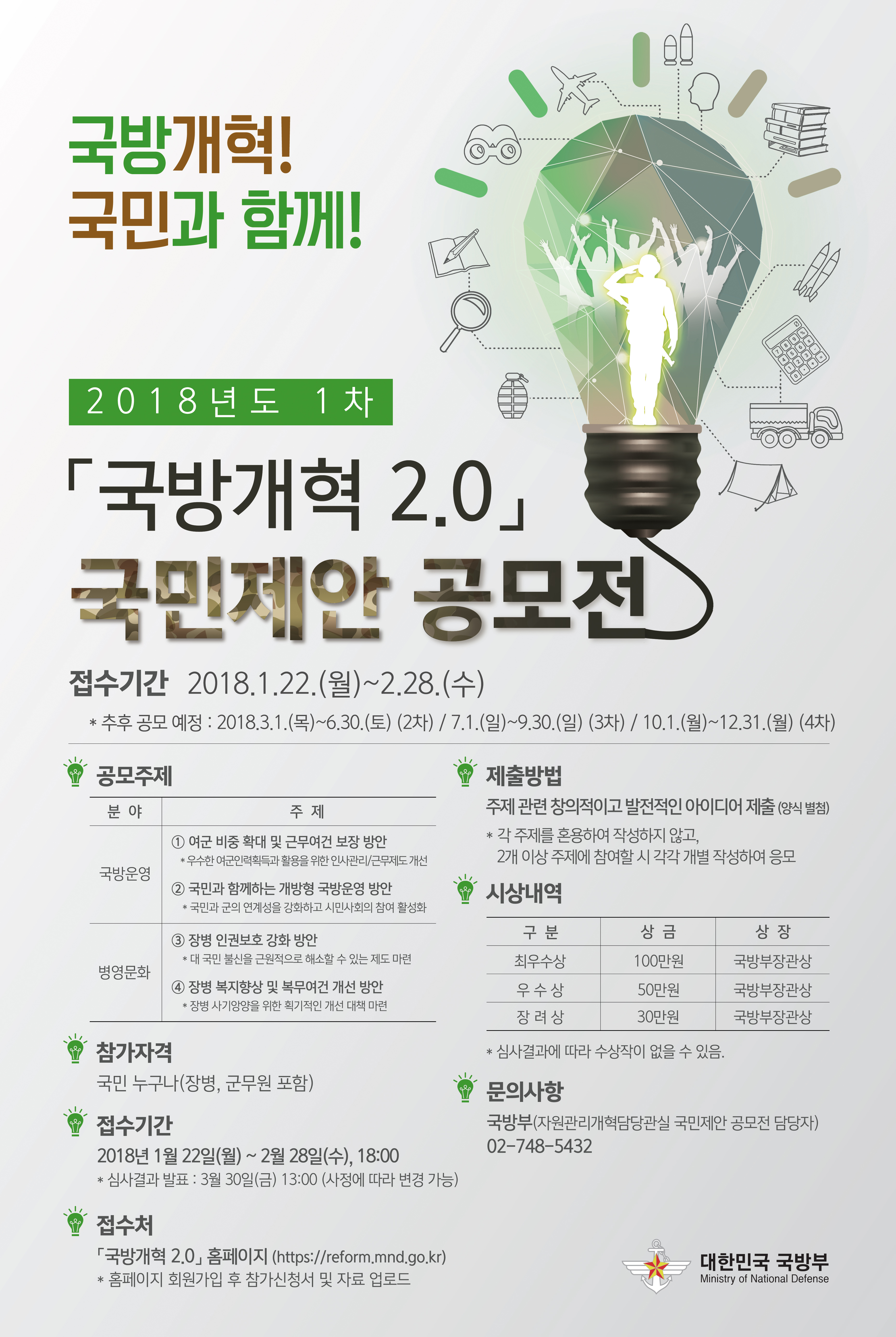 국방부에서는 국민(장병 및 군무원 포함)을 대상으로「국방개혁 2.0」에 대한 창의적인 아이디어를 연중 지속 발굴하기 위해「국방개혁 2.0」국민제안 공모전을 추진하고 있습니다.