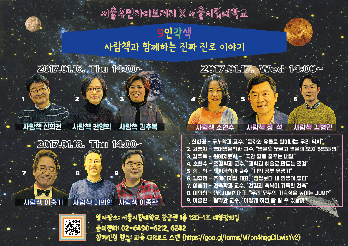 이번 겨울방학을 맞아 서울시립대학교 교수 6, 진로진학 분야에서 사람책으로 활동 중인 기업 대표 3명이 서울시민들과 소통하는9인각색, 사람책과 함께하는 진짜 진로 이야기행사를 운영하고자 하오니 많은 참여 바랍니다.