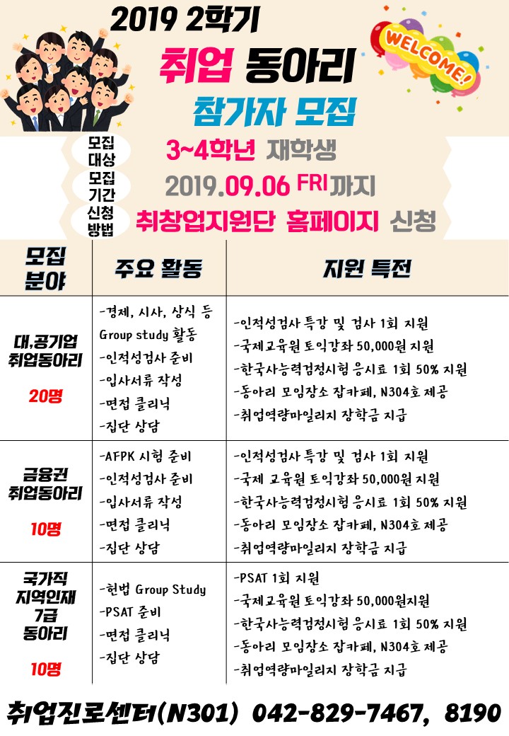 취업진로센터에서는 관심분야별로 취업준비생들이 모여 취업정보를 공유하고 스터디활동을 할 수 있도록 지원하고자 취업동아리 참가자를 모집합니다. 동아리 활동을 통해 취업의 꿈을 이루고 싶은 학생들의 많은 신청 바랍니다.