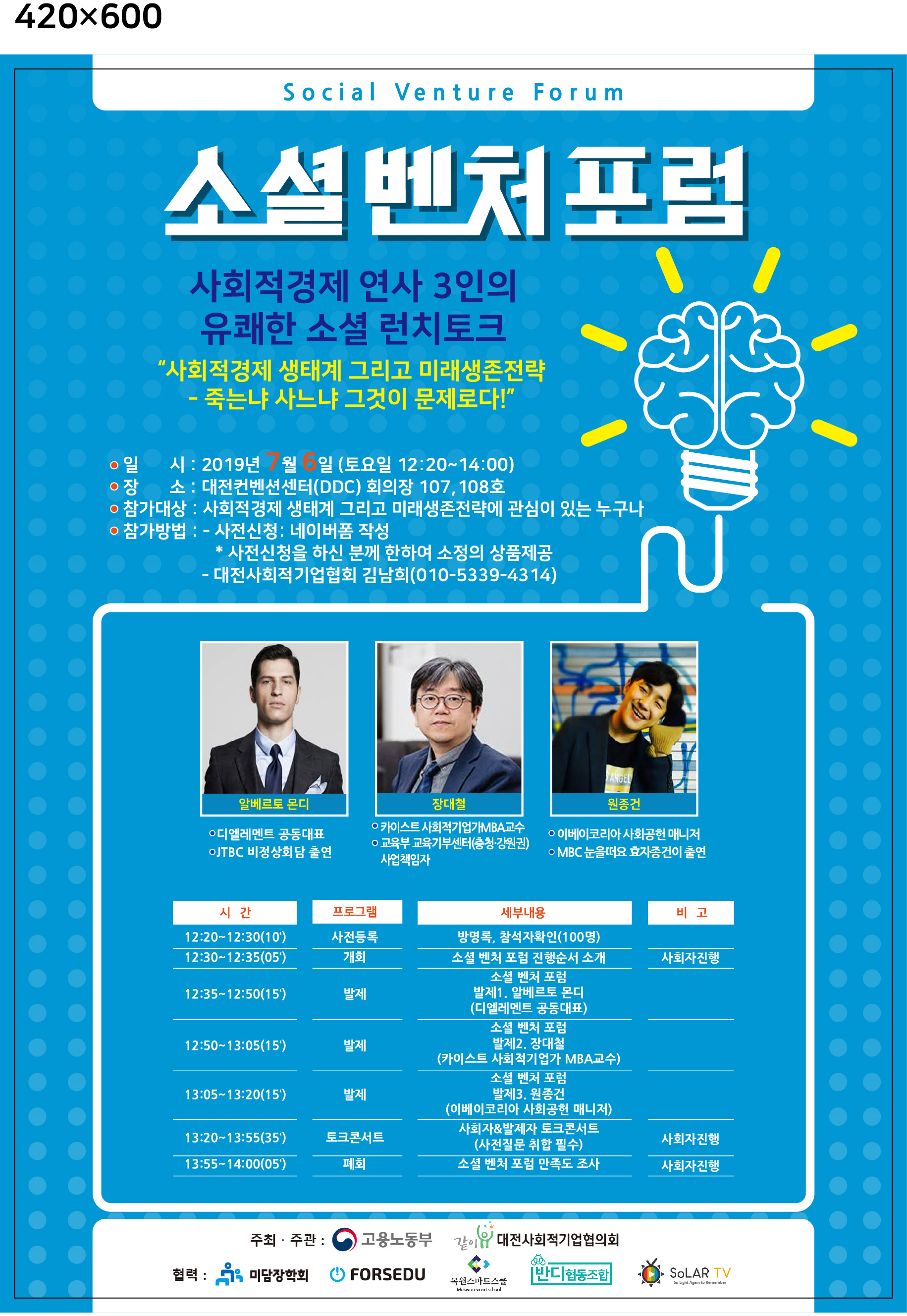 소셜벤처포럼 <사회적경제 연사 3인의 유쾌한 소셜 런치토크> “사회적경제 생태계 그리고 미래생존전략 - 죽는냐 사느냐 그것이 문제로다!” ❍ 일시 : 2019년 7월 6일 (토요일 12:30~14:00) ❍ 장소 : 대전컨벤션센터(DDC) 회의장 107,108호 ❍ 연사 - 알베르토 몬디 (디엘레멘트 공동대표 / JTBC비정상회담 출연) - 장대철 교수 (카이스트 사회적기업가MBA 교수 / 교육부 교육기부센터(충청,강원권) 사업책임자) - 원종건 매니저 (이베이코리아 사회공헌 매니저 / MBC 눈을떠요 효자종건이 출연) ❍ 참가대상: 사회적경제 생태계 그리고 미래생존전략에 관심이 있는 누구나 ❍ 참가방법: -사전신청: 네이버폼 작성 (http://naver.me/FyZHFBrj) *사전신청을 하신 분께 한하여 소정의 상품제공