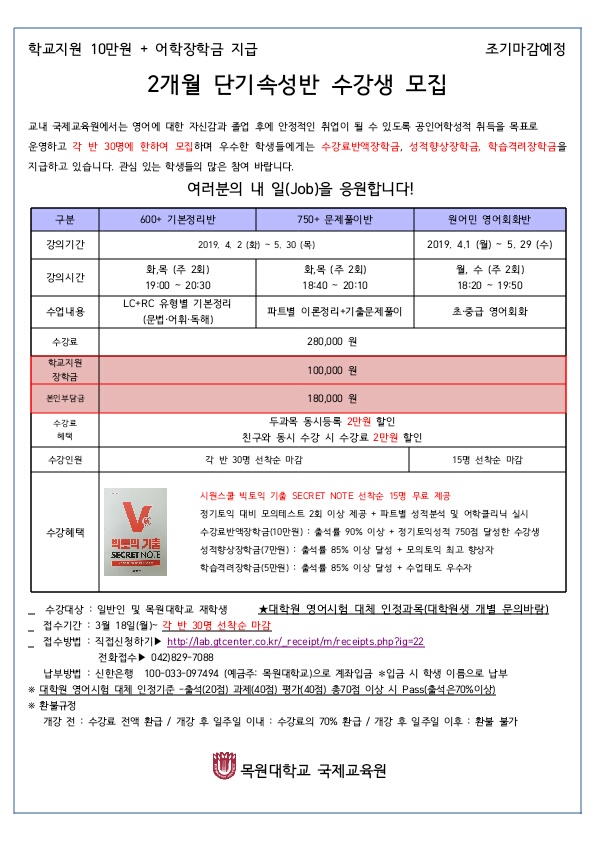 MOKWON UNIVERSITY교내 국제교육원에서는 영어에 대한 자신감과 졸업 후에 안정적인 취업이 될 수 있도록 공인어학성적 취득을 목표로 운영하고 각 반 30명에 한하여 모집하며 우수한 학생들에게는 수강료반액장학금, 성적향상장학금, 학습격려장학금을 지급하고 있습니다. 관심 있는 학생들의 많은 참여 바랍니다. 여러분의 내 일(Job)을 응원합니다! ★대학원 영어시험 대체 인정과목(대학원생 개별 문의바람) -수강대상 : 일반인 및 목원대학교 재학생 -접수기간 : 3월 18일(월)~ 각 반 30명 선착순 마감 -접수방법 : 직접신청하기▶ http://lab.gtcenter.co.kr/_receipt/m/receipts.php?ig=22 전화접수▶ 042)829-7088 ✻입금 시 학생 이름으로 납부 ※ 대학원 영어시험 대체 인정기준 -출석(20점) 과제(40점) 평가(40점) 총70점 이상 시 Pass(출석은70%이상) ※ 환불규정 개강 전 : 수강료 전액 환급 / 개강 후 1일 이내 : 수강료의 70% 환급 / 개강 후 2일 이후 : 환불 불가 |