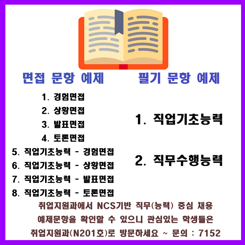 취업지원과에서 NCS기반 직무(능력) 중심 채용 면접문항과 필기문항 예제를 열람할 수 있으니 관심있는 학생들은 취업지원과로 방문하시기 바랍니다.