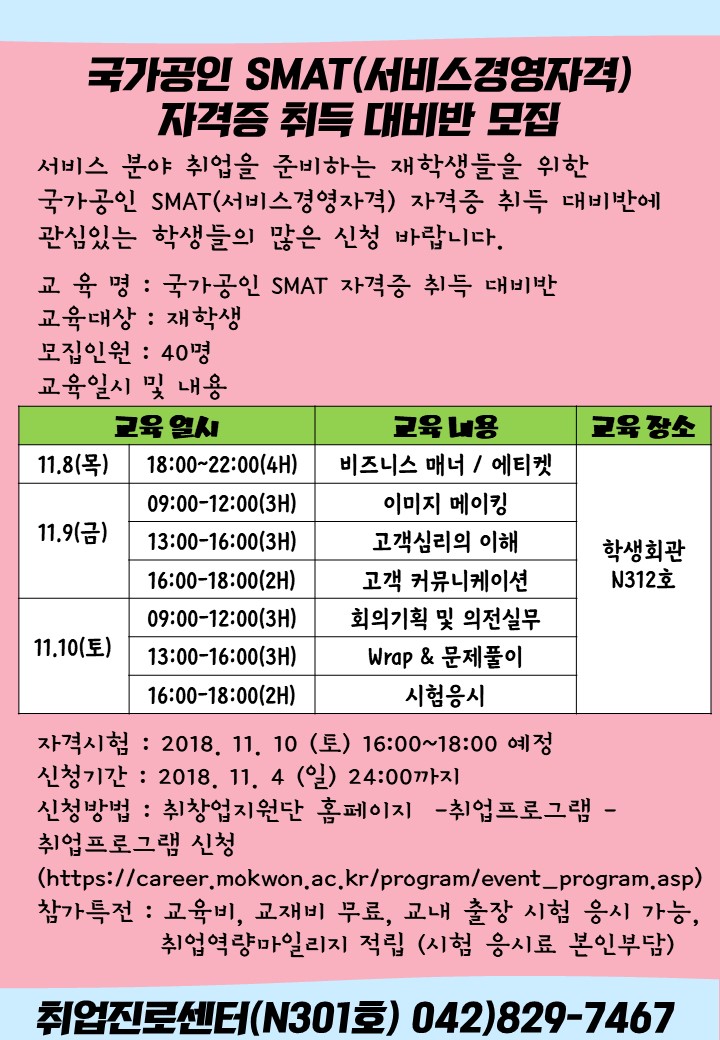 서비스 산업분야 취업을 준비하는 재학생들의 취업역량 향상을 위한 국가공인 SMAT(서비스경영자격) 자격증 취득 대비반을 모집하니, 학생들의 많은 신청 바랍니다.