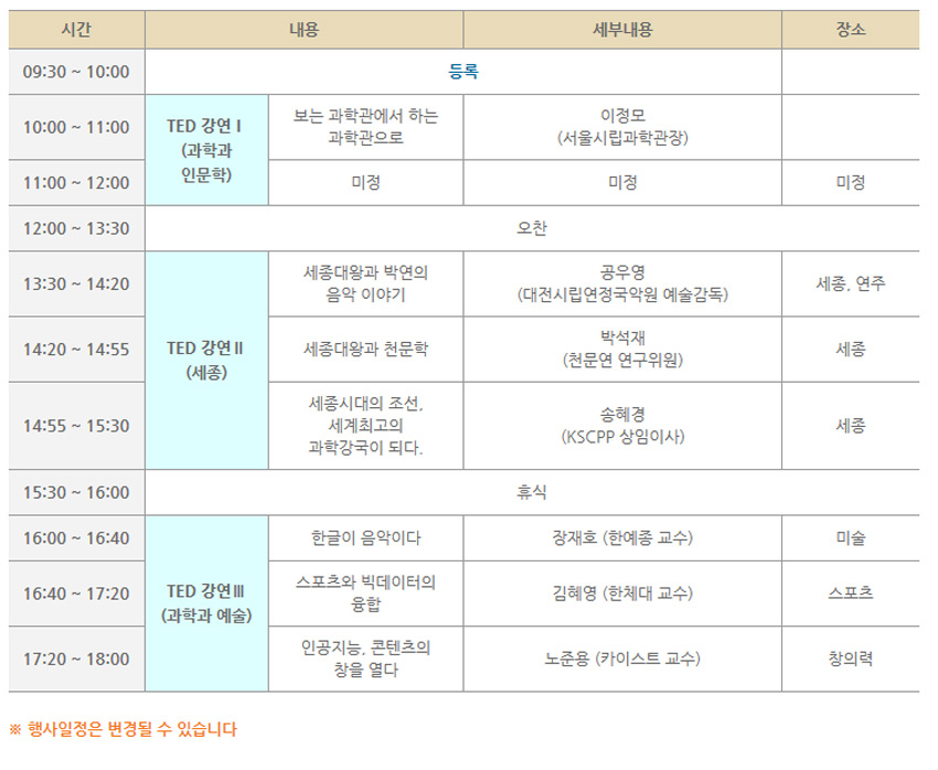 2018.10.23.(화) 09:30 ~ 18:00 TED식 강연 및 공연 (주제 : 과학과 문화의 융합) -천문학, 스포츠, 음악 등 다양한 주제 강연