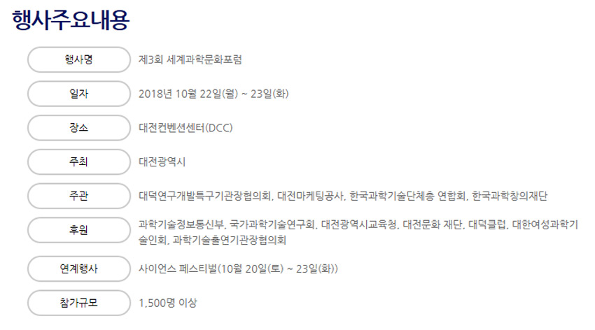 MOKWON UNIVERSITY<행사안내> 행사명 : 제3회 세계과학문화포럼 장르 : 대전 과학강연행사 날짜 : 2018년 10월 22일(월)~10월 23일(화) 시간 : 월 09:30~17:00, 화 09:30~18:00 장소 : 대전컨벤션센터(DCC) 관람등급 : 과학자, 일반 시민 및 고등학생 이상 소요시간 : 각 강연당 90분내외 주최 : 대전광역시 / 주관 : 대덕연구개발특구기관장협의회, 대전마케팅공사, 한국과학기술단체총 연합회, 한국과학창의재단 문의처 : 운영사무국 042-826-3810 무료입장사전 참가등록)(http://www.wscf.kr/2018/