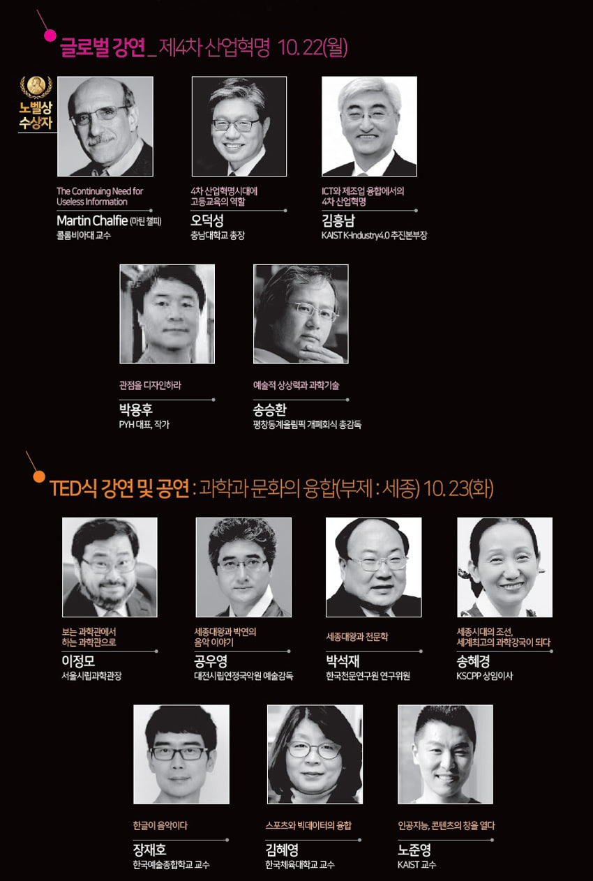 -콜롬비아대 교수 마틴챌피 -충남대학교총장 오덕성 -KAIST K-industry4.0추친본부장 김흥남 -작가 박용후 -평창동계올림픽 개폐회식 총감독 송승환 -서울시립과학관장 이정모 -대전시립연정국악원 예술감독 공우영 -한국천문연구원 연구위원 박석재 -KSCPP상임이사 송혜경 -한국예술종합학교 교수 장재호 -한국체육대학교 교수 김혜영