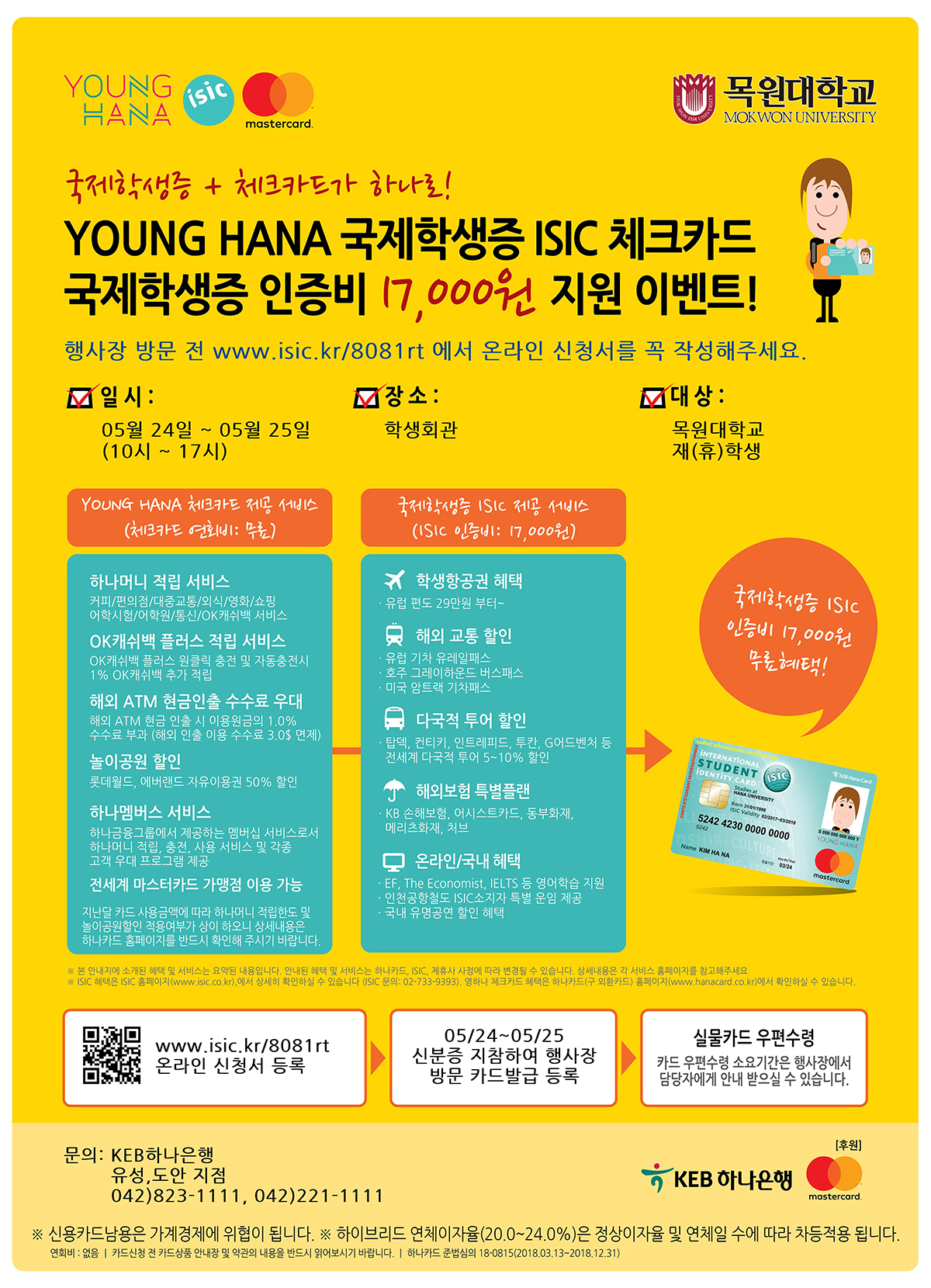 1. 발급대상 ○ 재학 또는 휴학 중인 내.외국인 학생 2. 행사기간 및 장소 ○ 기간 : 2018. 05. 21(월) ~ 05. 25.(금) 오전10시~오후5시 단, 22일(화) 제외 ○ 장소 : 학생회관 3. 발급절차 ○ 행사장 방문 전 사전 온라인 신청 : www.isic.kr/8081rt ○ 신분증(주민등록증 또는 운전면허증) 지참 ○ 행사장 방문 : 계좌개설 후 카드 자택 수령 4. 유효기간 ○ 국제학생증 유효기간은 발급월로부터 13개월간 유효 5. 발급비용 ○ 무료(국제학생증 발급비 17,000원 KEB하나은행 부담) ○ 행사기간만 적용함 (행사기간 종료 후 발급수수료 적용함) 6. 혜택 ○ 행사포스터 참조