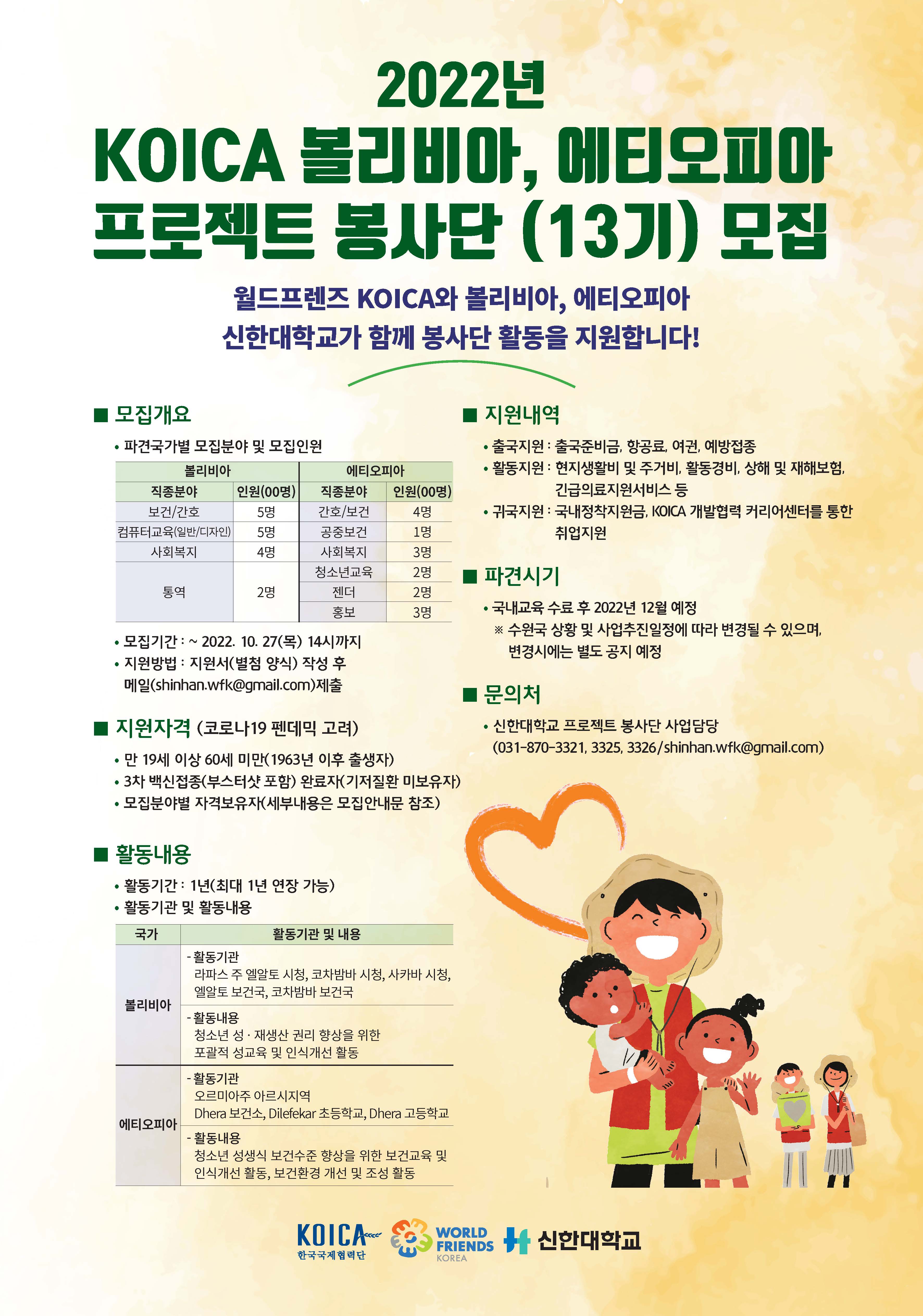 1) 모집분야: 보건분야 볼리비아, 에티오피아 프로젝트 봉사단 모집