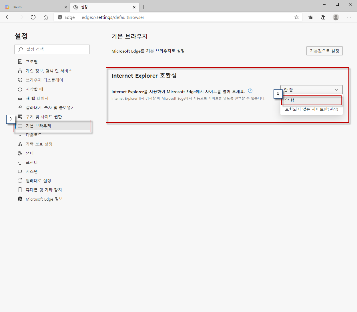 - 좌측 메뉴 중 "기본 브라우저" 를 클릭합니다.