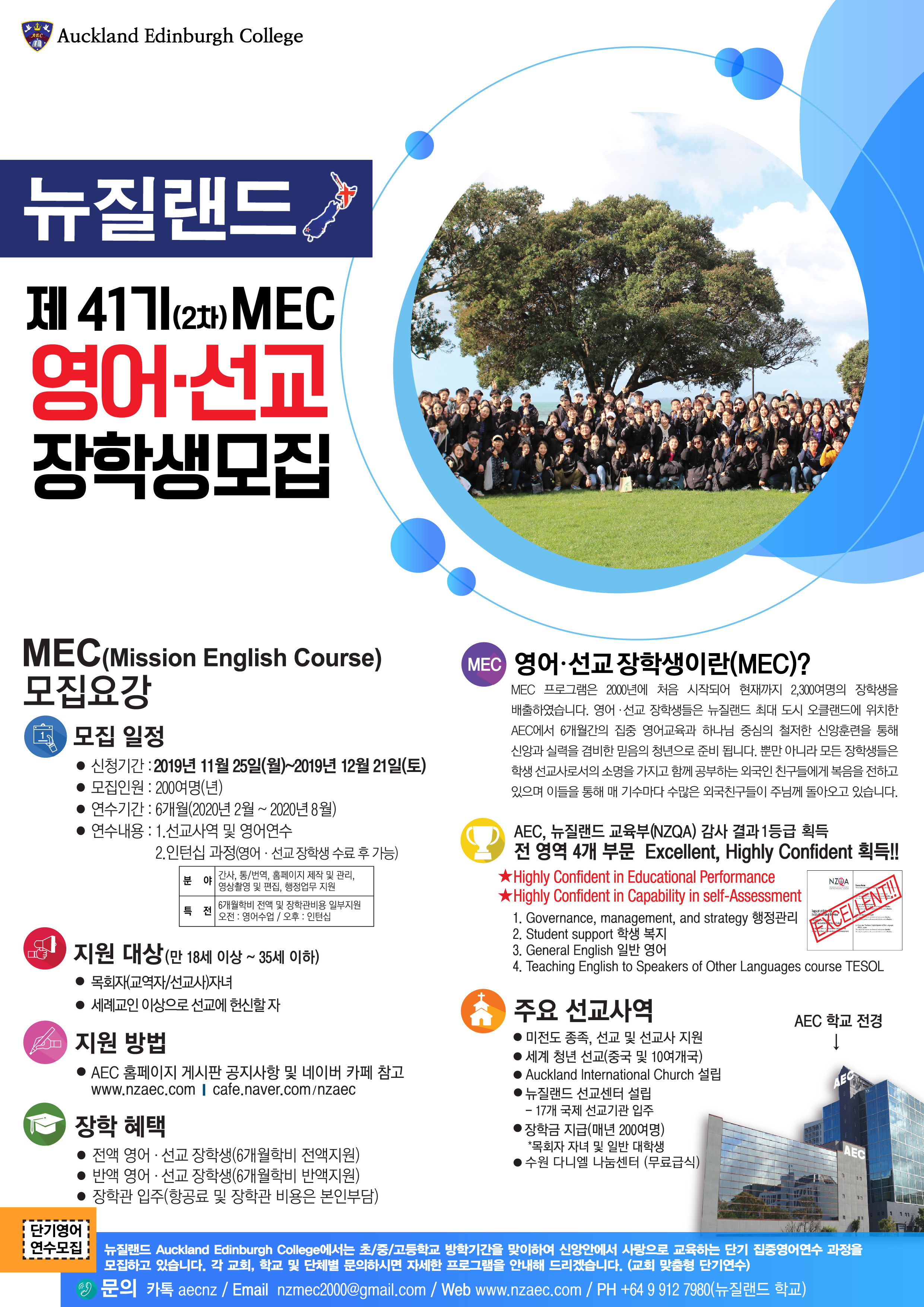 1. 자격 : 대학 재학생 이상(졸업생 가능) - 대상 1 : 목회자(교역자/선교사) 자녀 - 대상 2 : 세례교인 이상으로 선교에 헌신할 자 2. 연수기관 : New Zealand Auckland Edinburgh College 3. 연수기간 : 6개월(2020년 상반기 : 2020년 2월 ~ 2020년 8월) 4. 연수내용 : ① 선교사역 : 외국학생 선교사역, 뉴질랜드 아웃리치, 한글교육 및 클럽활동을 통한 선교, 로토루아 캠프, 양로원 봉사활동 등 ㅁ 연수내용 : ② 영어연수 : Full time 수준별 전문 12단계 집중영어연수 Courses 5. 장학혜택 : ① 전액 영어선교 장학생(6개월 학비 전액지원) - 년 00명 선발 ② 반액 영어선교 장학생(6개월 학비 반액지원) - 년 00명 선발 ③ 장학관 입주 ㅁ 장학혜택 * 왕복항공료 및 장학관비용(생활비 등)은 본인 부담 6. 전형방법 : 1차 서류전형, 2차 면접 7. 출발일정 : 2020년 2월 중순 예정 8. 서류제출기한 : 2019년 12월 21일(토) 까지 |