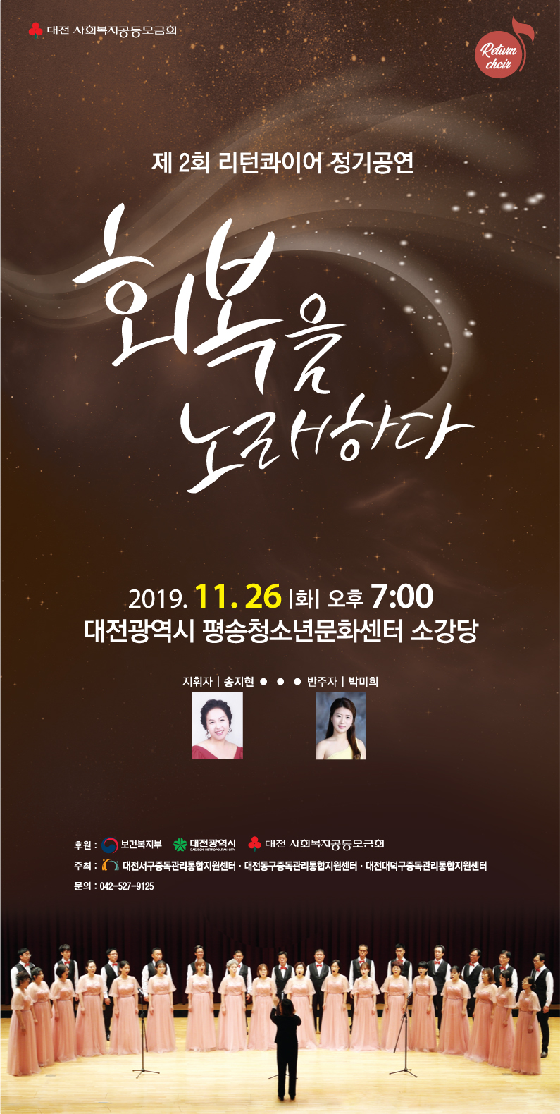MOKWON UNIVERSITY대전서구중독관리통합지원센터에서는 2019년 제 2회 리턴콰이어 합창단 정기공연을 아래와 같이 개회하고자 하오니 적극적인 참여와 관심부탁드립니다. 홍보내용: 2019년 제 2회 리턴콰이어 핮창단 정기공연 ‘회복을 노래하다’ 2. 신청기간: 2019.11.20.(수)까지 3. 공연일시: 2019.11.26.(화) 19:00~21:00 4. 장 소: 대전광역시 평송청소년문화센터 소강당 5. 문 의: 대전서구중독관리통합지원센터 T. 042)527-9125 / (이메일: djalchol@hanmail.net)(팩스: 042-527-9126) |