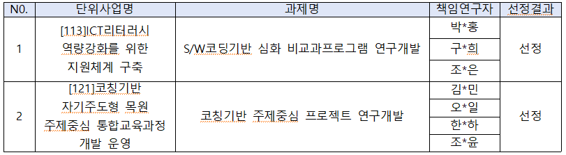 지원 자격 및 신청 제한 요건 ○연구책임자 : 본교 전임교원만 가능함 (본교 겸임 교원 및 강사는 공동연구원으로 참여 가능) ○중복 신청 제한 ▪연구책임자 기준으로 1개의 교과목만 신청할 수 있음 ▪연구책임자 기준으로 1개의 비교과 프로그램만 신청할 수 있음 ▪교과목 1개와 비교과 프로그램 1개를 중복하여 신청하는 것은 가능함 4. 연구내용 ○문화예술융합전공 CORE 교과목 개발 총 16개 교과목 ▪ 15주차 강의를 위한 강의교안을 개발하거나 강의용 교재를 개발하여야 함 ○문화예술융합전공 연계 비교과 프로그램 총 4개 ▪ 5차시~10차시 정도의 비교과 프로그램 운영을 위한 수업교안을 개발하여야 함 5. 신청․접수 ▪ 신청접수 : 대학교육혁신단 ▪ 제출기한 : 2019.11.20.(수) 18:00 ▪ 신청방법 : 이메일 접수(yskim@mokwon.ac.kr) ▪ 제출서류 : 개발신청서 1부 6. 선정 절차 ▪ 평가항목 및 배점 등 세부 심사계획은 대학교육혁신단이 수립, 시행 ▪ 전문위원회에서 1차 서류심사, 2차 종합평가를 통해 대상 선정 7. 사업 추진 일정 : 사업품의 결재일에 따라 변경 가능 ▪ 사업신청 공고 : 2019.11.11.(월) ▪ 사업신청 마감 : 2019.11.20.(수) ▪ 공모선정 발표 : 2019.11.22.(금) 예정 ▪ 진단연구개발 결과보고서 제출 : 2020.01.06.(월) ※ 기안 내 원하는 시기에 제출 가능 8. 연구비 지급 ▪ 해당 과정 연구개발 결과보고서 제출, 평가 후 지급. ▪ 연구 결과보고서 작성 양식은 추후 연구 과제 선정 발표와 함께 업로드 할 예정 ▪ 교과목 연구개발 결과보고서의 분량은 A4기준 70매 이상(PPT의 경우 2개의 슬라이드를 1페이지로 인정) ▪ 비교과 프로그램 연구개발 결과보고서의 분량은 A4기준 40매 이상(PPT의 경우 2개의 슬라이드를 1페이지로 인정) 9. 문의처 ▪ 이메일 : yskim@mokwon.ac.kr ▪ 전 화 : 042-829-8147(대학교육혁신단 김연수 연구원)