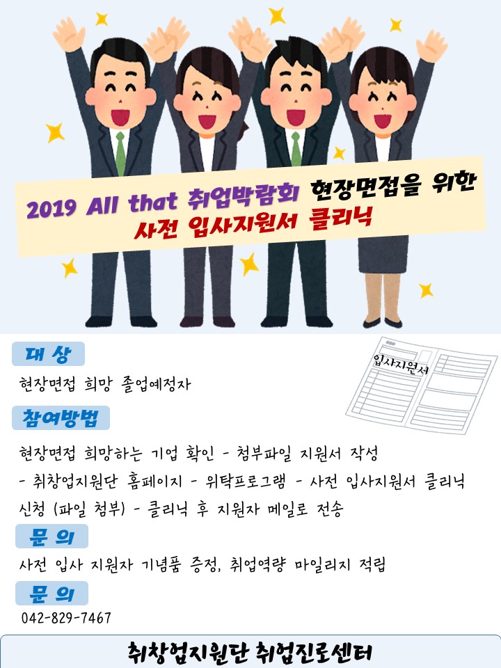 취업진로센터에서는 2019 All that 취업박람회를 개최하여 현장면접을 위한 사전 입사지원서 클리닉을