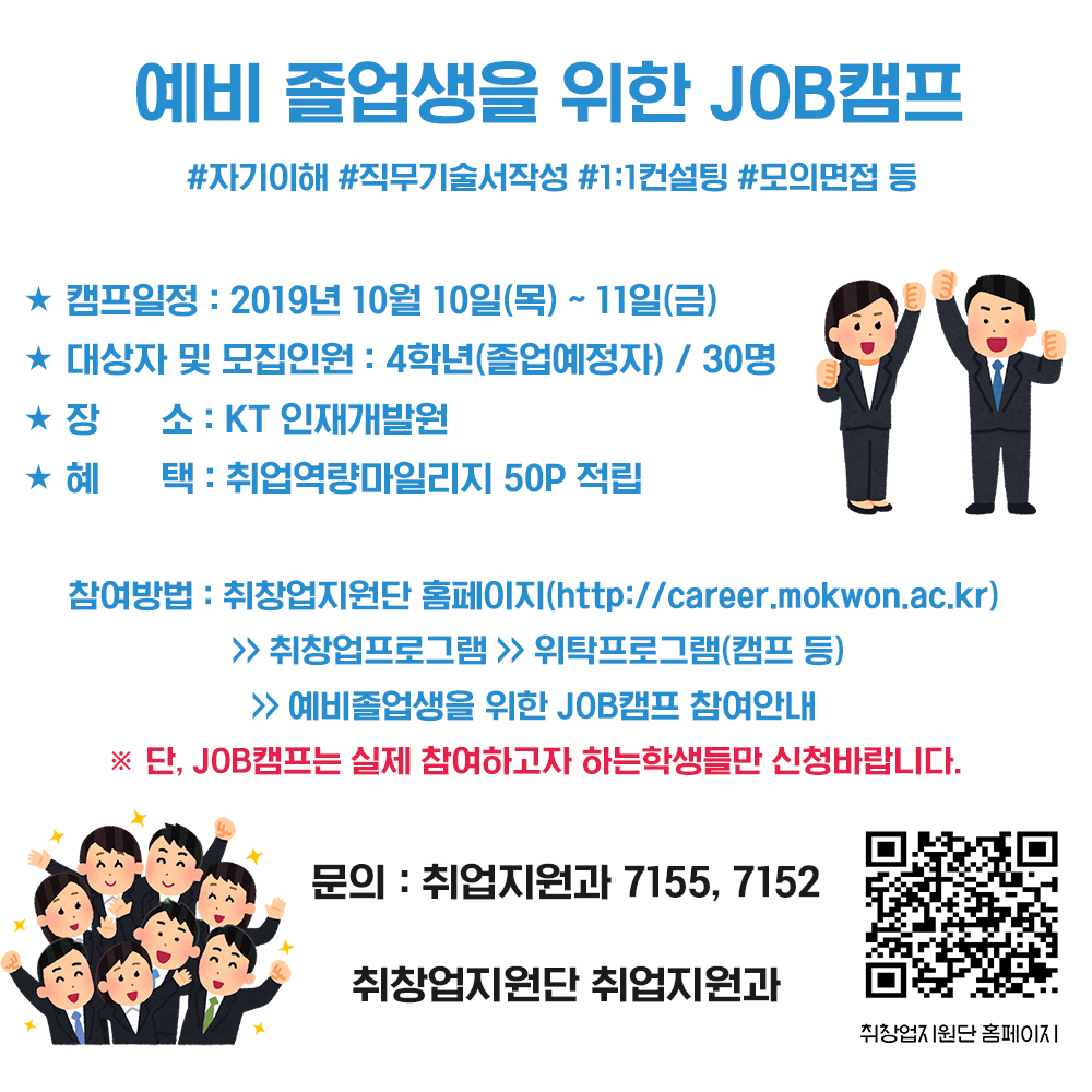 MOKWON UNIVERSITY취업지원과에서는 취업준비에 어려움을 겪고 있는 예비 졸업자를 중심으로 컨설팅을 통한 행동의 변화 및 정확한 직무이해, 목표기업 설정 등 취업경쟁력을 향상시키고자 아래와 같이 JOB캠프를 운영하오니, 4학년(졸업예정자) 학생들의 많은 참여 바랍니다. ★프로그램 구성 1. 자기이해를 통한 객관적인 자기점검 2. 목표기업 분석 및 SWOT분석을 통한 학과별 직무이해 3. 실전에서 요구되는 학과별 취업역량강화 4. NCS역량기반 입사서류 첨삭 5. 면접스킬 및 이미지 컨설팅 ★대상: 4학년(졸업예정자) ★문의: 829-7155, 7152 ※프로그램의 내용은 변경가능 |