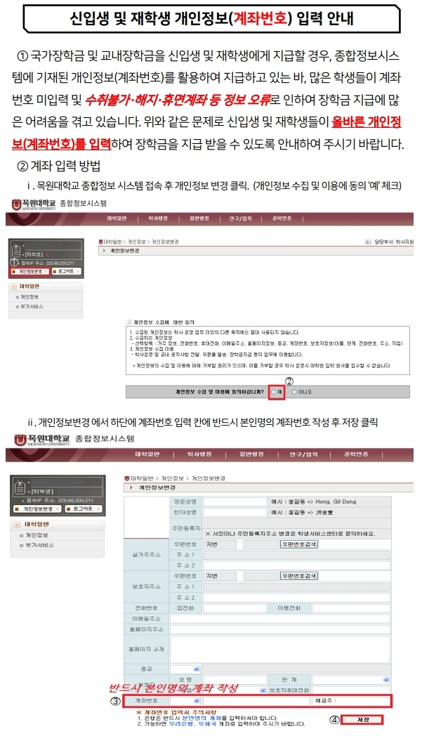 [필독] 신입생 및 재학생 개인정보(계좌번호) 입력 요청 안내