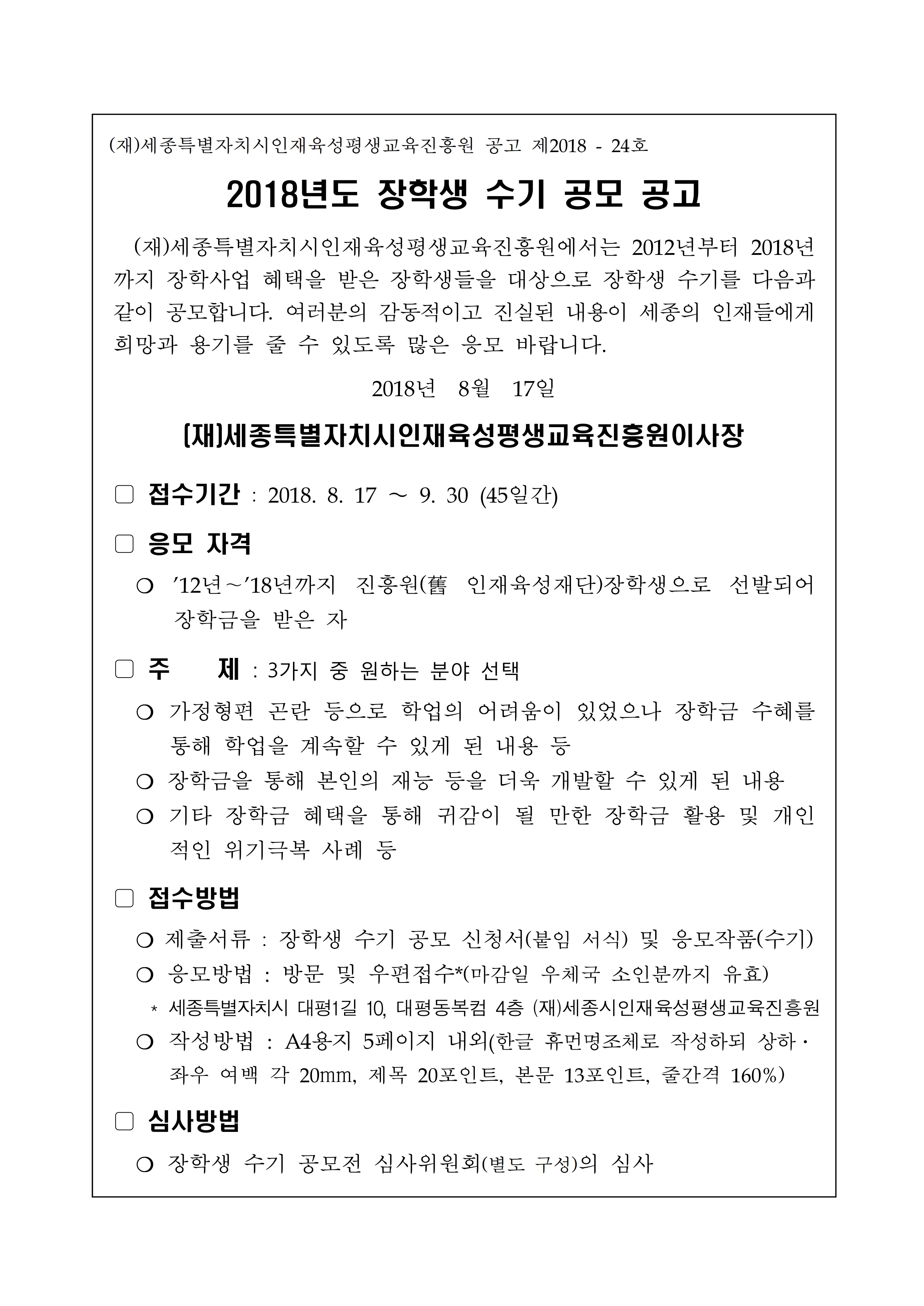 세종특별자치시인재육성평생교육진흥원 제2회 장학생 수기 공모전 안내