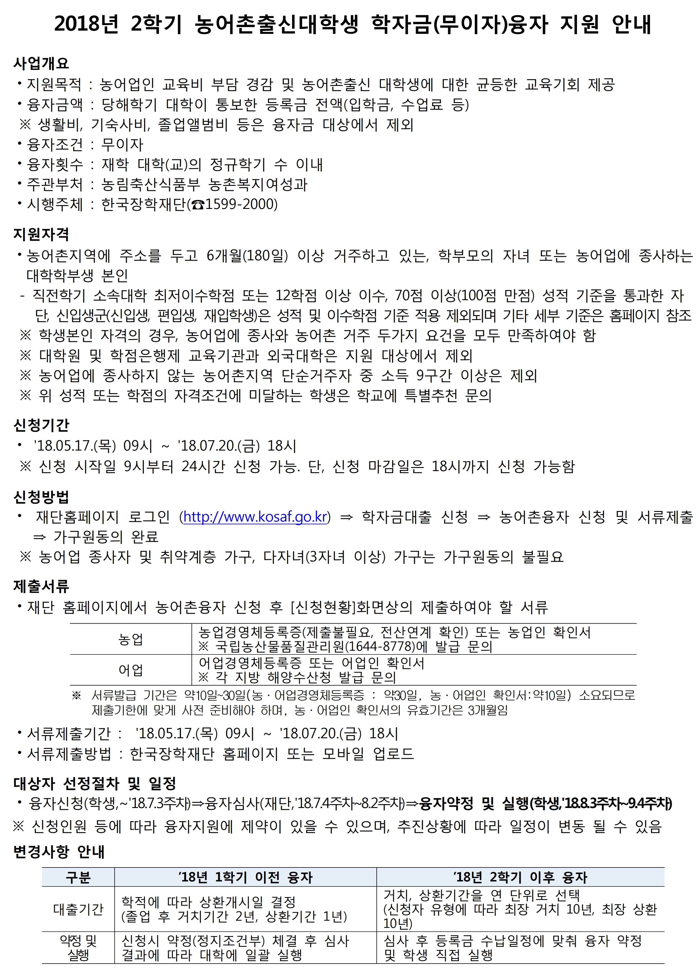 2018년 2학기 농어촌출신대학생 학자금(무이자)융자 지원 안내 사업개요 ⦁지원목적 : 농어업인 교육비 부담 경감 및 농어촌출신 대학생에 대한 균등한 교육기회 제공 ⦁융자금액 : 당해학기 대학이 통보한 등록금 전액(입학금, 수업료 등) ※ 생활비, 기숙사비, 졸업앨범비 등은 융자금 대상에서 제외 ⦁융자조건 : 무이자 ⦁융자횟수 : 재학 대학(교)의 정규학기 수 이내 ⦁주관부처 : 농림축산식품부 농촌복지여성과 ⦁시행주체 : 한국장학재단(☎1599-2000) 지원자격 ⦁농어촌지역에 주소를 두고 6개월(180일) 이상 거주하고 있는, 학부모의 자녀 또는 농어업에 종사하는 대학학부생 본인 - 직전학기 소속대학 최저이수학점 또는 12학점 이상 이수, 70점 이상(100점 만점) 성적 기준을 통과한 자 단, 신입생군(신입생, 편입생, 재입학생)은 성적 및 이수학점 기준 적용 제외되며 기타 세부 기준은 홈페이지 참조 ※ 학생본인 자격의 경우, 농어업에 종사와 농어촌 거주 두가지 요건을 모두 만족하여야 함 ※ 대학원 및 학점은행제 교육기관과 외국대학은 지원 대상에서 제외 ※ 농어업에 종사하지 않는 농어촌지역 단순거주자 중 소득 9구간 이상은 제외 ※ 위 성적 또는 학점의 자격조건에 미달하는 학생은 학교에 특별추천 문의 신청기간 ⦁ "18.05.17.(목) 09시 ~ "18.07.20.(금) 18시 ※ 신청 시작일 9시부터 24시간 신청 가능. 단, 신청 마감일은 18시까지 신청 가능함 신청방법 ⦁ 재단홈페이지 로그인 (http://www.kosaf.go.kr) ⇒ 학자금대출 신청 ⇒ 농어촌융자 신청 및 서류제출 ⇒ 가구원동의 완료 ※ 농어업 종사자 및 취약계층 가구, 다자녀(3자녀 이상) 가구는 가구원동의 불필요 제출서류 ⦁재단 홈페이지에서 농어촌융자 신청 후 [신청현황]화면상의 제출하여야 할 서류