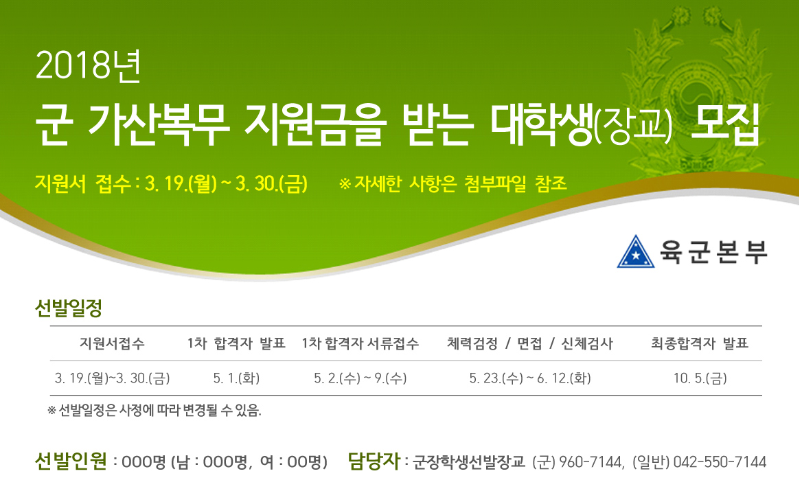 붙임 1. 18년 군 가산복무지원금을 받는 대학생(장교) 선발 공고문 1부.