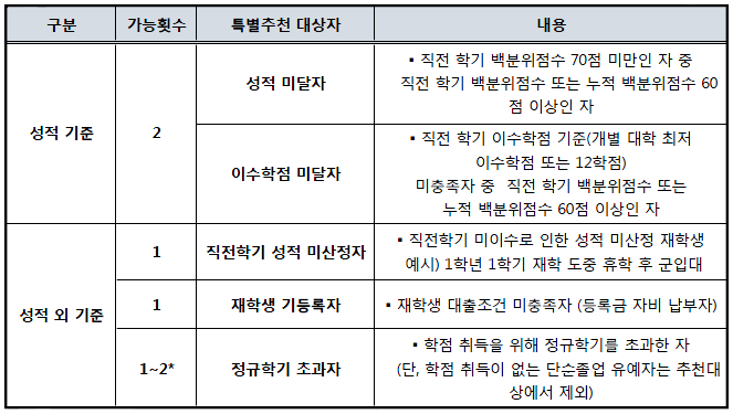 ※ 신입생(군)은 입학허가 외에 별도의 특별추천 불필요하며, 재학생 중 대출 시행일 전 등록금 수납기간이 마감되어 부득이하게 당해학기 등록금을 자비 납부한 경우 소명자료 제출 시 특별추천 횟수에 미포함 ※ 재학생 기등록자/기납부자(분납)가 특별추천을 받아 등록금 대출을 지원 받은 경우 대출사실을 부모에 통지할 수 있음 ㅇ 특별추천 횟수는 각 사유별 허용횟수 제한 - (성적 기준) 성적 및 이수학점 미달자 2회 - (성적 외 기준) 재학생 성적 미산정자 1회, 재학생 기등록자/ 기납부자 중 자비납부자 1회 ※ 가능 횟수는 ’09년 2학기 학자금대출부터 산입 및 인정되며, 학생 1인 기준으로 판단 ㅇ 재학생 기등록자/기납부자 중 자비납부자는 특별추천을 통해 매학기 등록금 대출 신청 및 실행 기간 내 등록금 대출 지원