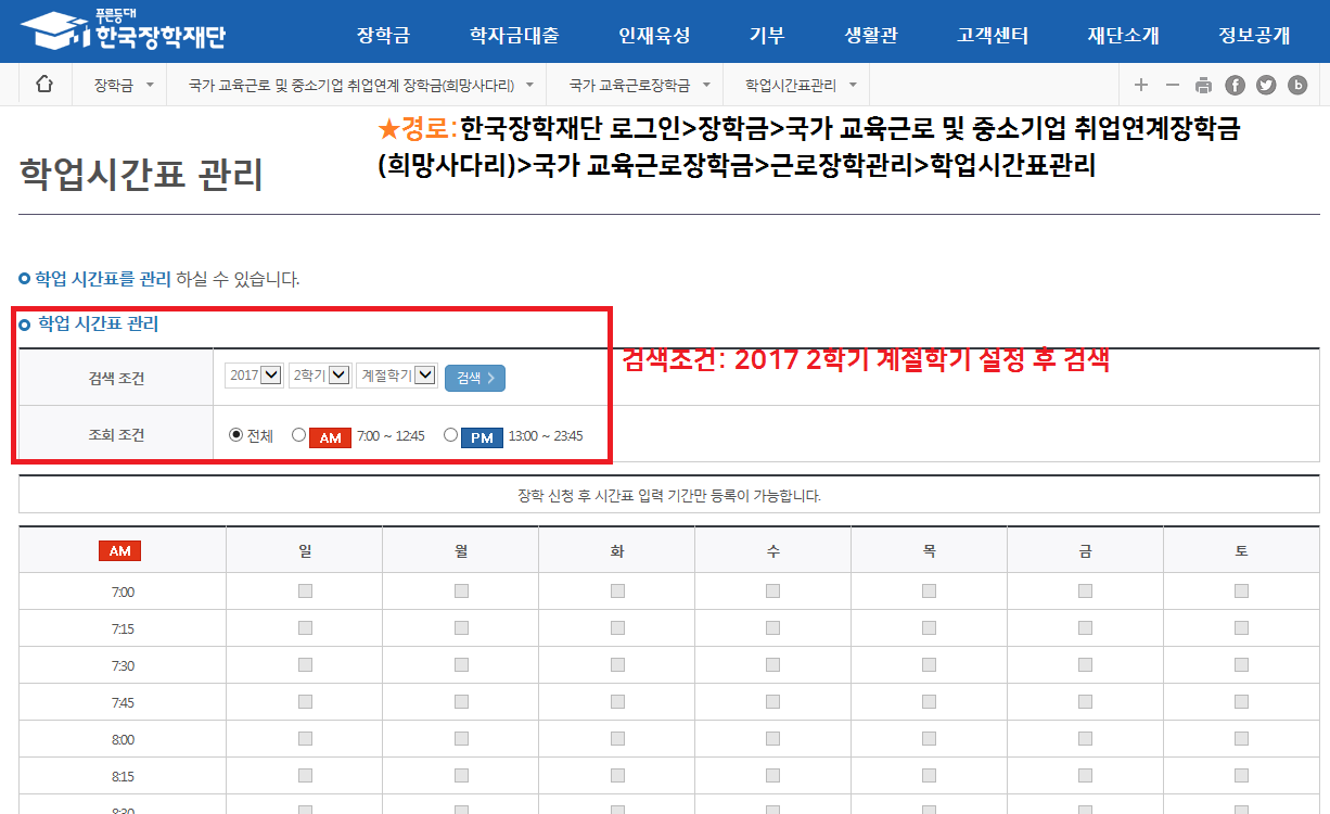 4.동계방학 계절학기 시간표입력 안내(동계방학 계절학기를 수강하는 학생만 입력) 가. 대상자: 2017-2학기 국가교육근로생 중 동계방학 계절학기 수업을 이수하는 학생 나. 동계방학 계절학기 시간표 입력 기간 : 2017.12.19.(화)~2017.12.26.(화) 까지(입력기한 엄수, 입력기간 이후에는 입력 불가능) 다. 입력방법: 한국장학재단 홈페이지에서 입력(붙임자료 매뉴얼 참고) 라. 유의사항 1) 동계방학 계절학기 수업을 이수하는 학생만 시간표를 입력(동계방학 계절학기 수업을 이수하지 않는 학생은 미 입력) 2)동계방학 계절학기 시간표를 입력하지 않아 발생하는 부정수급에 대해서는 국가교육근로장학금 환수조치 3)동계방학 계절학기 시간표에 입력된 수업시간표 외에 근로 진행(수업 시간표에 입력된 시간에 근로 시 출근부 입력 불가)