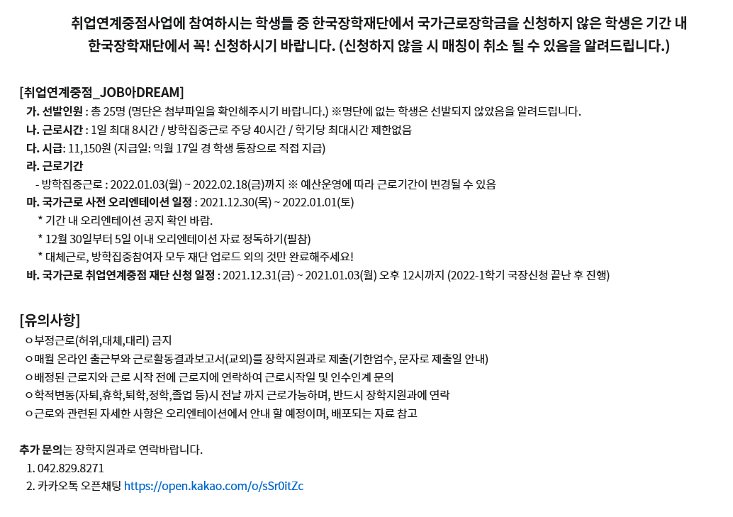 MOKWON UNIVERSITY취업연계중점사업에 참여하시는 학생들 중 한국장학재단에서 국가근로장학금을 신청하지 않은 학생은 기간 내 한국장학재단에서 꼭! 신청하시기 바랍니다. (신청하지 않을 시 매칭이 취소 될 수 있음을 알려드립니다.)
