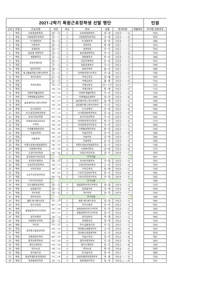 붙임 2021-2학기 목원근로장학생 선발명단 1부. 끝.