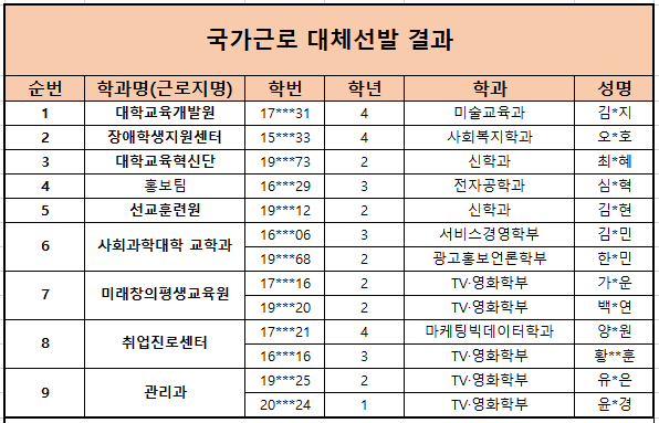 마. 선발된 학생은 근로지 담당자와 상의하여 날짜를 조정후 28일부터 근로진행