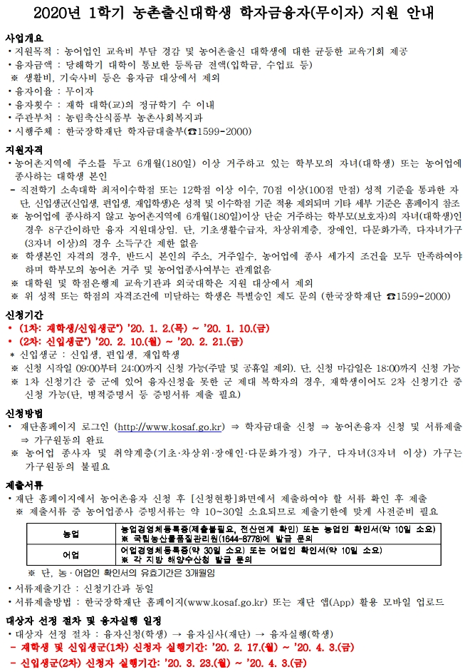 2020년 1학기 농촌출신대학생 학자금융자(무이자) 지원 안내