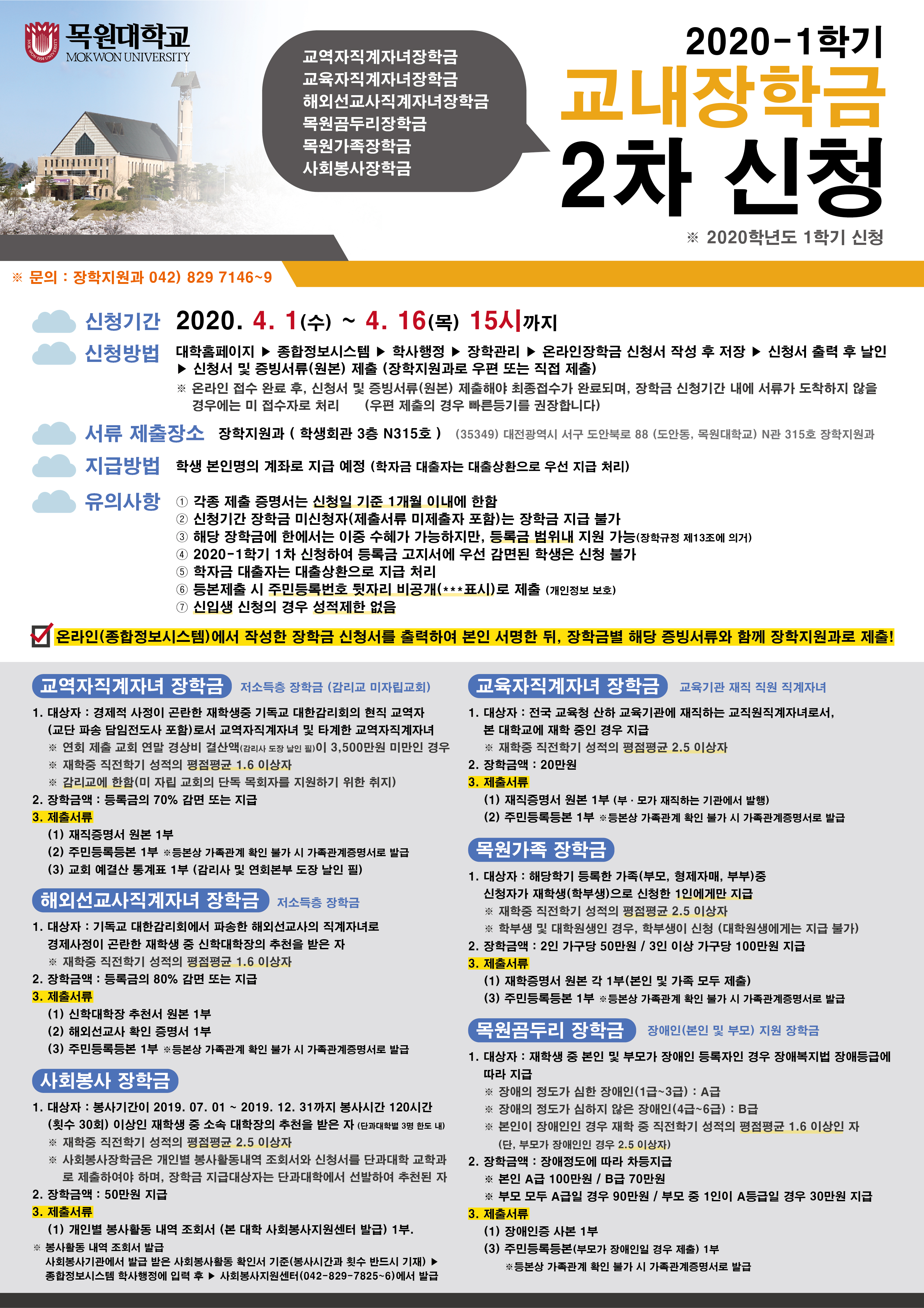 ※ 온라인(종합정보시스템)에서 작성한 장학금 신청서를 출력하여 본인 서명한 뒤, 장학금별 해당 증빙서류와 함께 장학지원과로 제출하여 주시기 바랍니다. ※ 문의사항 : 장학지원과 042-829-7146~9 |