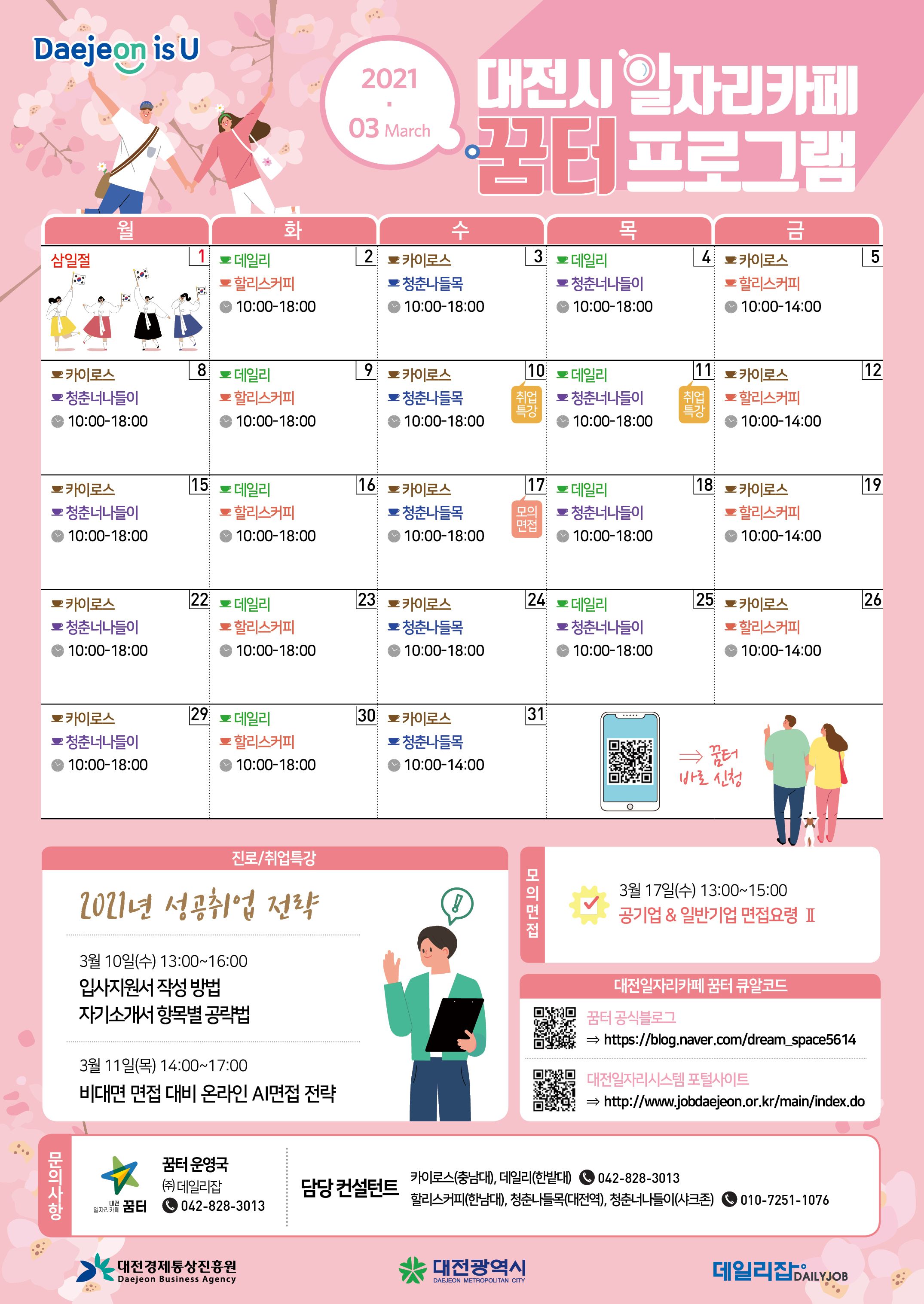 MOKWON UNIVERSITY본교 취업지원과에서는 대전경제통상진흥원에서 운영하는 대전일자리카페 꿈터의 다양한 프로그램 아래와 같이 안내하오니, 우리 학생들의 많은 참여 바랍니다.