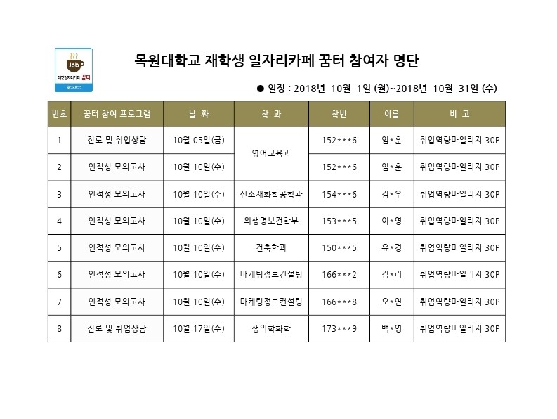 11월에도 많은 이용 바랍니다. 11월 일정표는 별도로 안내되오니, 참고하시고 이용하시기 바랍니다.(꿈터 4호점 이외의 일자리카페를 이용하셔도 동일하게 취업역량마일리지를 드리오니 참고 바람)문의: 취업지원과 7152, 7155, 8255- 취업지원과 -
