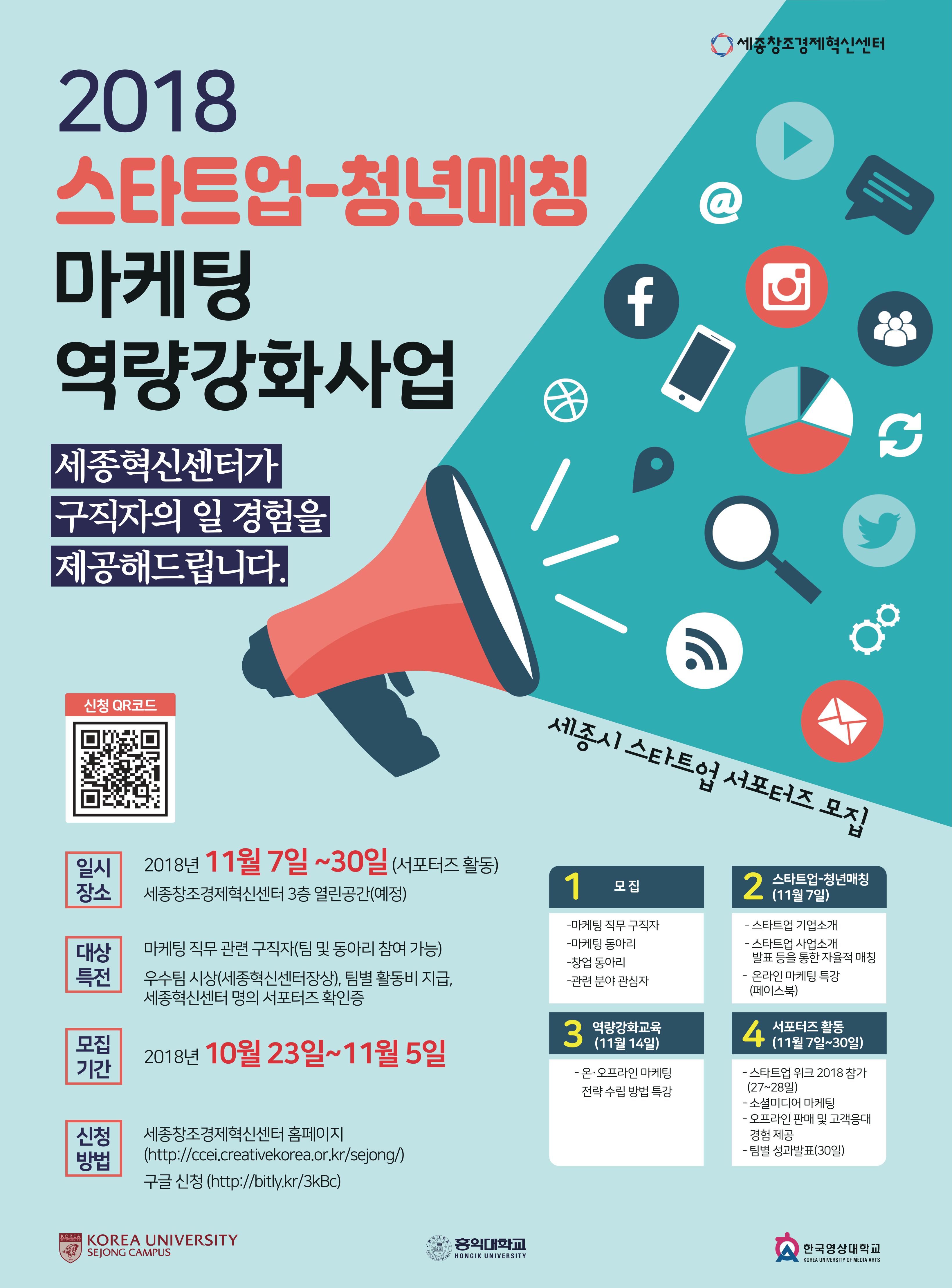 MOKWON UNIVERSITY1. 서포터즈 활동기간 : 11월 7일 ~ 11월 30일 2. 서포터즈 활동내용 : 가. 스타트업 워크 2018 참가 (11월 27일 ~ 28일) 나. 소셜 미디어 마케팅 활동 (세종시 내에 위치한 스타트업 홍보) 다. 오프라인 마케팅 활동 3. 서포터즈 특전 : 가. 우수팀 시상 (세종혁신센터장상) 나. 팀별 활동비 지급 다. 혁신센터 서포터즈 수료증 발급 4. 서포터즈 지원 대상 : 마케팅 직무 관련 구직자 (개인 또는 팀, 동아리 모두 지원가능) 5. 교육문의 : 세종혁신센터 고용지원본부 044-999-1026 / jobs2030@ccei.kr 6. 교육상세내역 및 신청양식 : https://goo.gl/forms/ -취업지원과- |