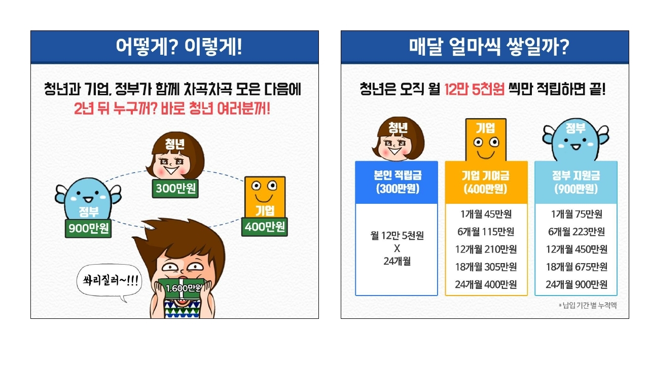 ★ 청년내일채움공제란?- 중소·중견기업에 취업한 청년 근로자의 장기근속을 위하여 고용노동부와 중소벤처기업부가 공동으로 운영하는 공제. - 청년근로자와 사업주 및 정부가 공동으로 적립한 공제금에 복리이자를 더하여 2년 이상 장기재직한 근로자에게 성과보상금 형태로 만기 공제금(1,600만원 + 이자) 지급