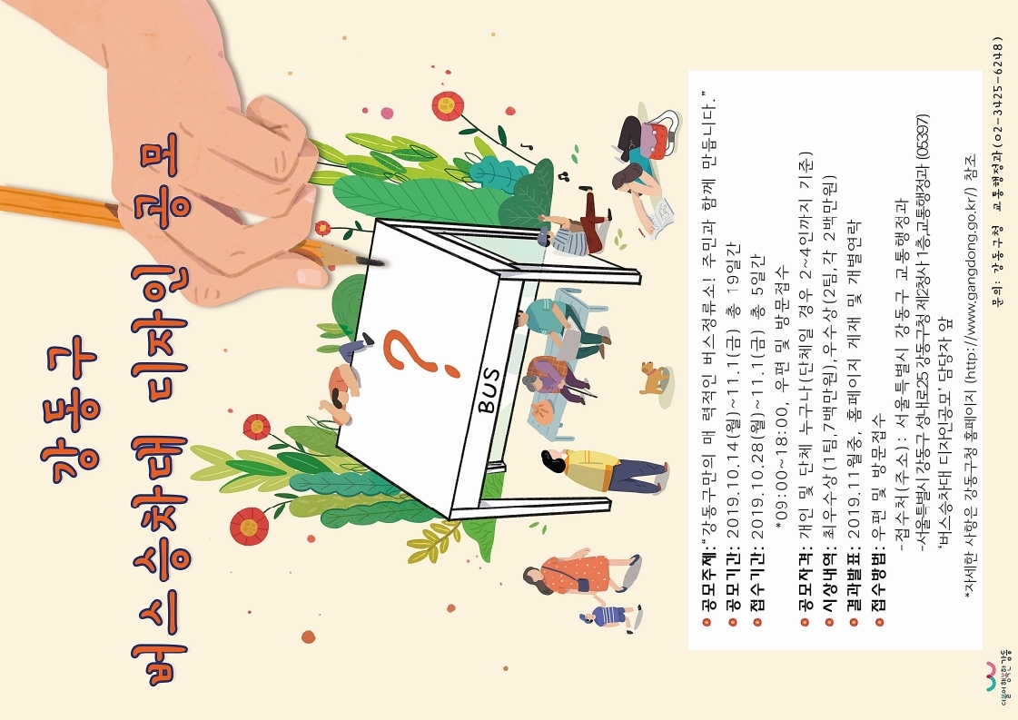 ?? 공모개요 - 공모주제: “강동구만의 매력적인 버스정류소! 주민과 함께 만듭니다.” - 접수기간: 2019.10.28.(월)~11. 1.(금) 18:00 까지 - 응모자격: 개인 및 단체 누구나(단체일 경우 2~4인까지 기준) - 공모부분: 버스승차대(Bus shelter) - 공모대상지: 강동구 추천 정류소 3개소 중 택1 ※ 자세한 사항은 홈페이지(https://www.gangdong.go.kr) 참조