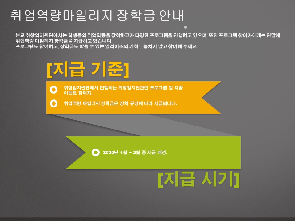MOKWON UNIVERSITY본교 취창업지원단에서는 학생들의 자기개발과 진로탐색 및 취업역량강화에 도움을 주고자 다양한 취업관련 프로그램을 진행하고 있습니다. 이에, 취업지원관련 프로그램에 참여한 학생들에게 취업역량마일리지를 적용하여 향후 “취업역량 마일리지 장학금”을 아래와 같이 지급할 예정이오니 취업지원관련 프로그램에 많이 참여하여 주시기 바랍니다.