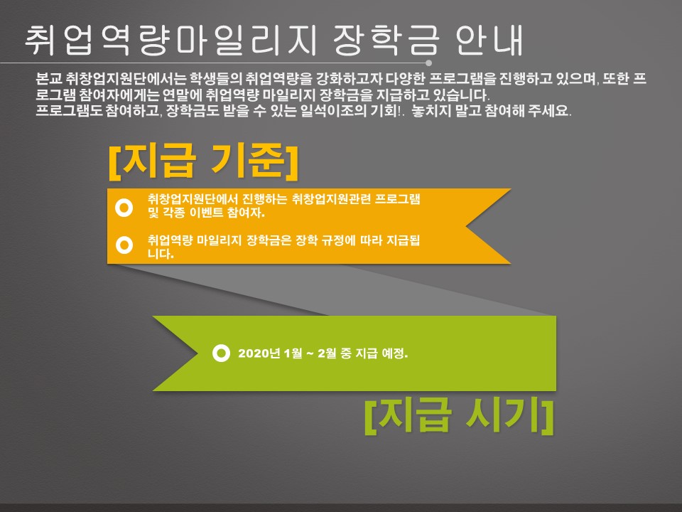 1. 홍보내용 : 취업역량 마일리지 장학금 2. 지급시기 : 2020년 1월~2월 중 지급 될 예정임. 3. 지급기준 : 취창업지원단에서 진행하는 취업지원관련 프로그램 및 각종 이벤트 참여자. (붙임파일 참조. 단, 붙임파일에 기재되지 않은 프로그램의 경우, 기존 프로그램과 비교하여 동일하게 마일리지 적용.) 4. 기타 가 : 취업역량마일리지는 장학규정에 따라 지급 되며, 종합정보시스템에 입력된 계좌로 입금되니 꼭 계좌등록을 해주셔야됩니다. 나 : 장학규정에 따라 휴학 및 제적학생, 이수학기 초과자, 최소학점 미 이수자 등은 장학생으로 선발 될 수 없으니 참고 하시기 바랍니다. 5. 취창업지원단 홈페이지 : 목원대학교 취창업지원단 홈페이지 : https://career.mokwon.ac.kr/ 페이스북 페이지 : https://www.facebook.com/mwjob.net 네이버 카페(취창업지원단) : http://job.mokwon.ac.kr 인스타그램(취창업지원단) : 계정 - mw_job_coaching 6. 문의: 취업지원과 7152, 7155