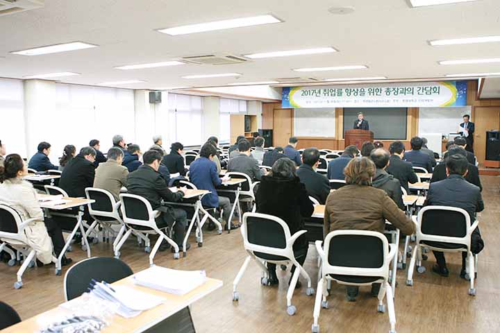 우리 대학 인력개발원은 지난 28일 학생회관에서 취업률 향상을 위한 총장과의 간담회를 가졌다. 인력개발원, 취업률 향상 "총장과의 간담회" 개최 우리 대학 인력개발원은 지난 28일 오후5시 학생회관 3층 회의실에서 "2017년 하반기 2차 취업률 향상을 위한 간담회"를 개최했다. 이번 간담회는 총장을 비롯, 입학취업처장, 인력개발원장, 각 학부(과)장 및 취업멘토링교수 등 70여명이 참석했으며, 간담회에 참석한 박노권 총장은 취업과 관련한 모든 분들이 여러 가지 어려운 상황 가운데에서도 취업률 향상에 협조해 주셔서 감사하다"며 "앞으로도 학교의 발전을 위해 더욱 노력해 달라"고 격려했다. 한편 인력개발원에서는 취업률 향상을 위해 개인창작활동 종사자 인정기준과 정부지원 청년 고용정책에 대하여 취업상담교수인 전윤선 교수와 배성숙 교수가 발표를 하였으며, 단과대학별 전년 대비 취업률 우수학과의 국제문화학과 외 6개 학부(과)에서 취업률을 향상 시킬 수 있었던 좋은 사례를 발표하는 시간을 갖기도 하였다. 유장환 입학취업처장은 "모든 구성원이 지금까지 관심을 갖고 취업률 향상에 노력해 주셨듯이 마지막 12월 31일까지 최선을 다해 달라"고 당부했다. |